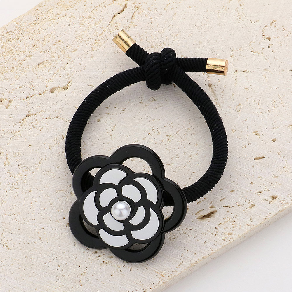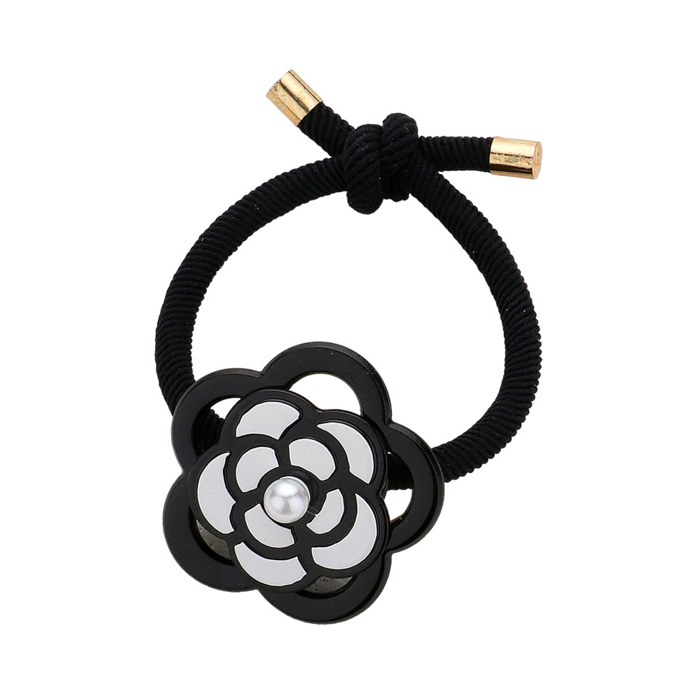 Details • Size : 1.5" H • Stretchable • Elevate your hairstyle with this floral accent elastic hair tie featuring a chic flower charm with a pearl-inspired centerpiece. Designed with a flexible band for a secure hold, it blends elegance with everyday practicality, making it perfect for casual and dressy looks alike. • Handmade