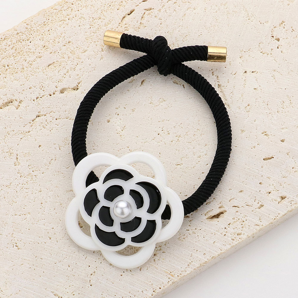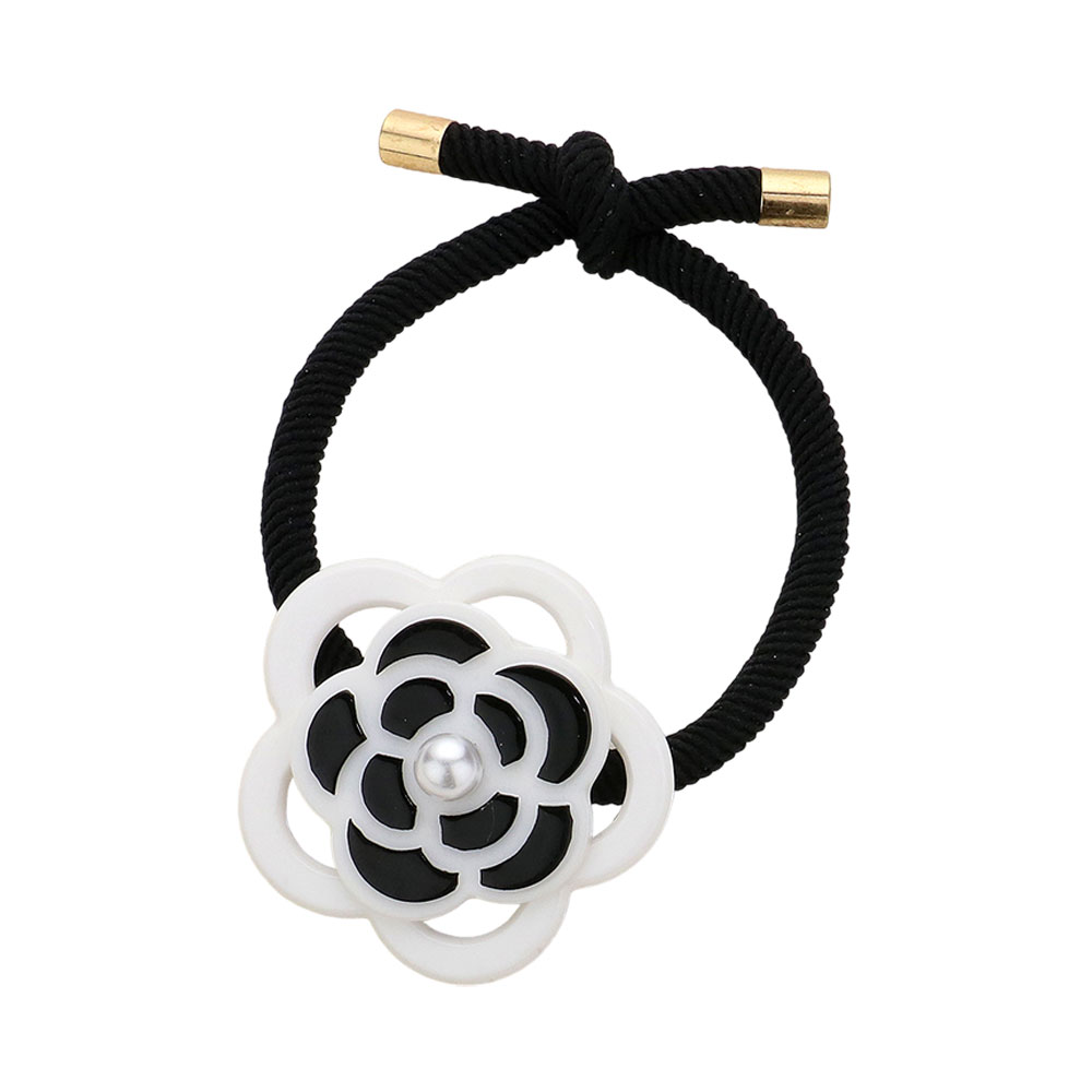 Details • Size : 1.5" H • Stretchable • Elevate your hairstyle with this floral accent elastic hair tie featuring a chic flower charm with a pearl-inspired centerpiece. Designed with a flexible band for a secure hold, it blends elegance with everyday practicality, making it perfect for casual and dressy looks alike. • Handmade