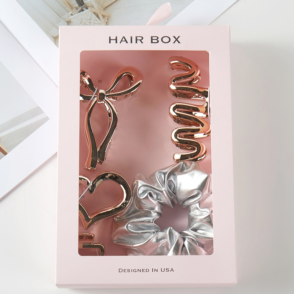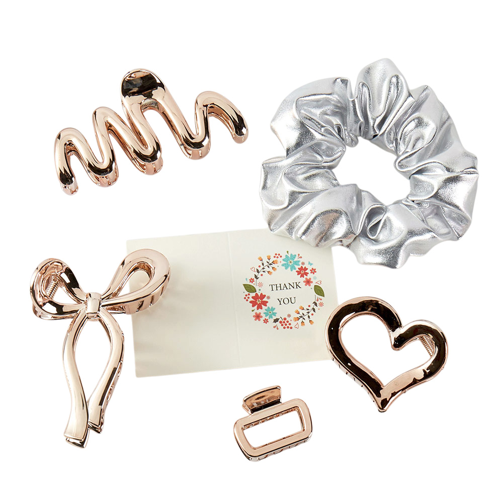 5PCS - Chrome Open Heart Bow Hair Clips Stretchable Fabric Hair band Set