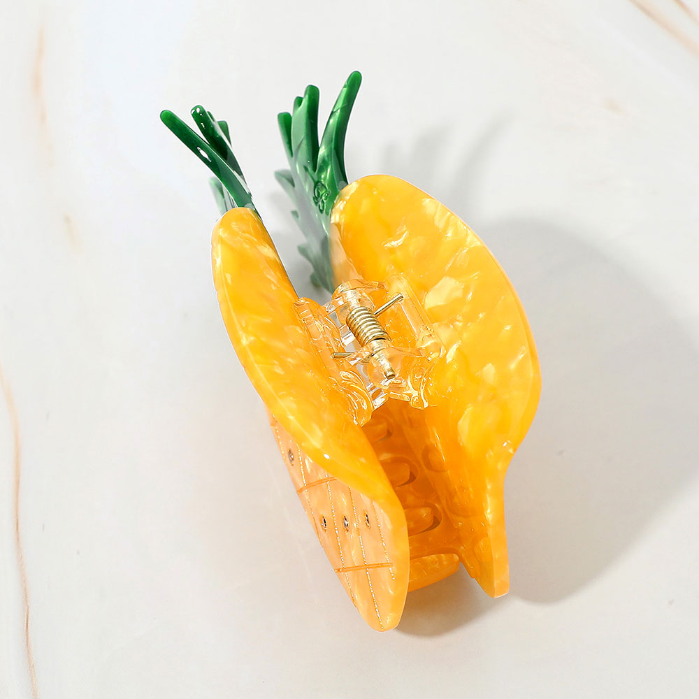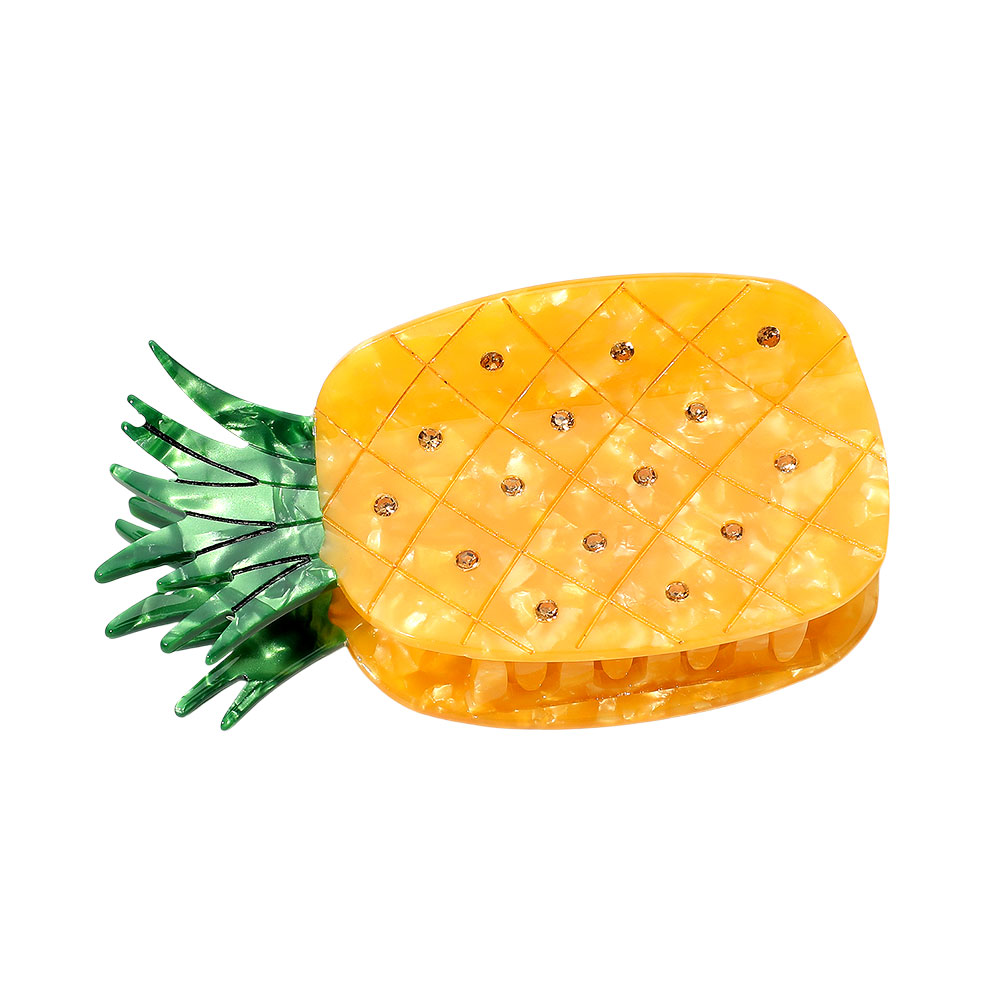 Details • Size : 3.8" X 1.8" • Add a tropical touch to your style with this pineapple shape hair claw clip featuring rhinestone accents. Fun and functional, it ensures a secure grip while giving your hairstyle a playful and refreshing vibe.