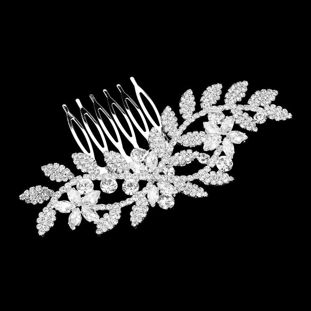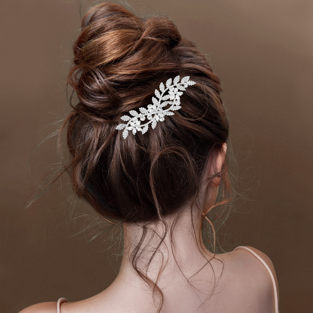 Details • Size : 4" X 1.6" • Floral cz crystal hair clip with elegant leaf accents, ideal for weddings, proms, and special occasions. Enhances updos with a sparkling touch of sophistication and timeless charm. • CZ Cubic Zirconia • Lead and Nickel Compliant