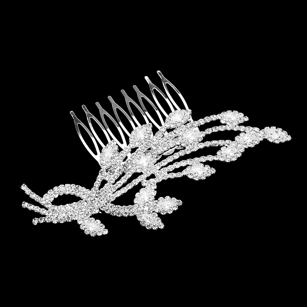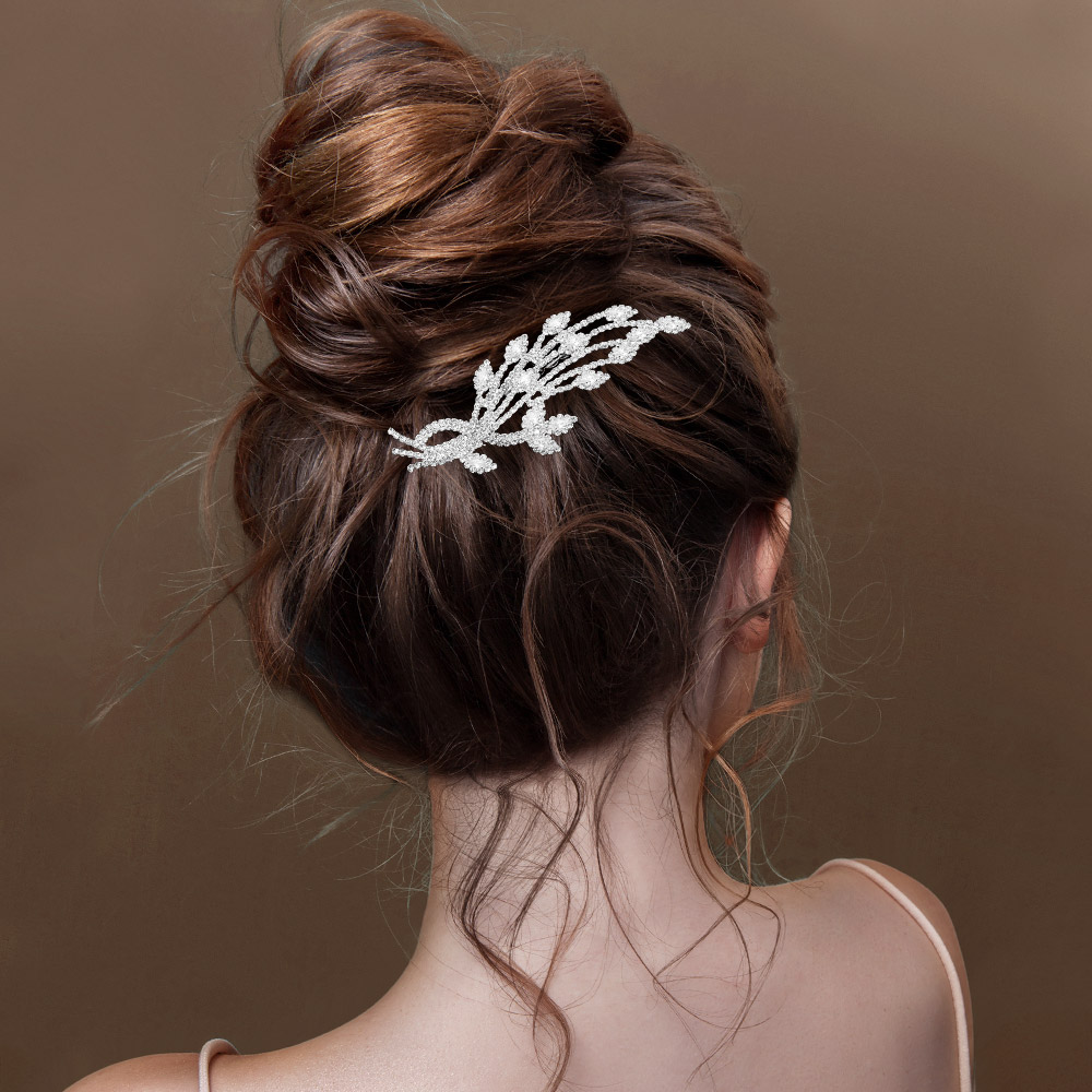 Details • Size : 4" X 1.6" • Sparkling hair comb with a leaf vine design and cz crystal accents. Ideal for weddings, proms, and elegant occasions, this piece enhances updos and styled hair with a refined botanical charm. • CZ Cubic Zirconia • Lead and Nickel Compliant