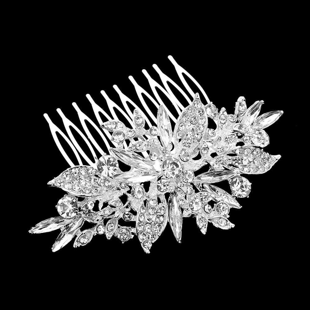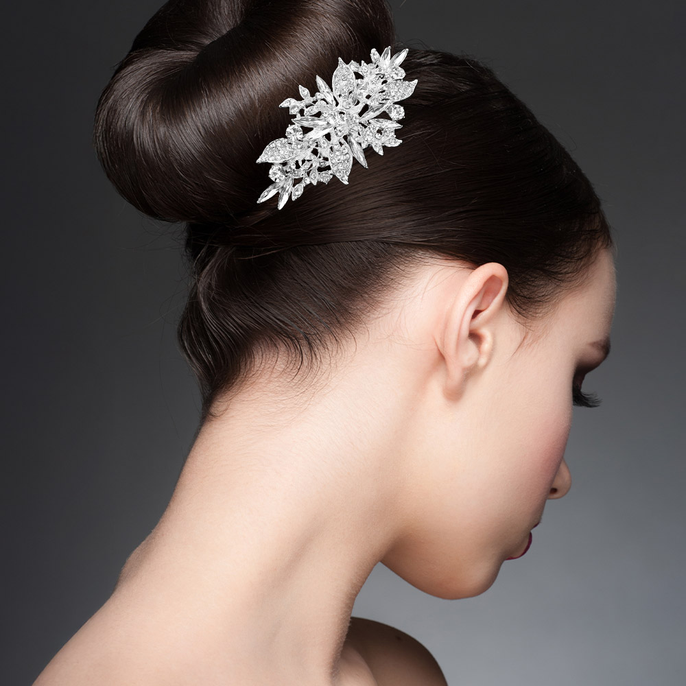 Details • Size : 3.8" X 1.8" • This elegant floral hair clip showcases a refined leaf pattern with brilliant sparkle, ideal for weddings, proms, or formal events. Designed for secure wear and standout beauty, it adds graceful sophistication to any updo or styled hair look. • Lead and Nickel Compliant
