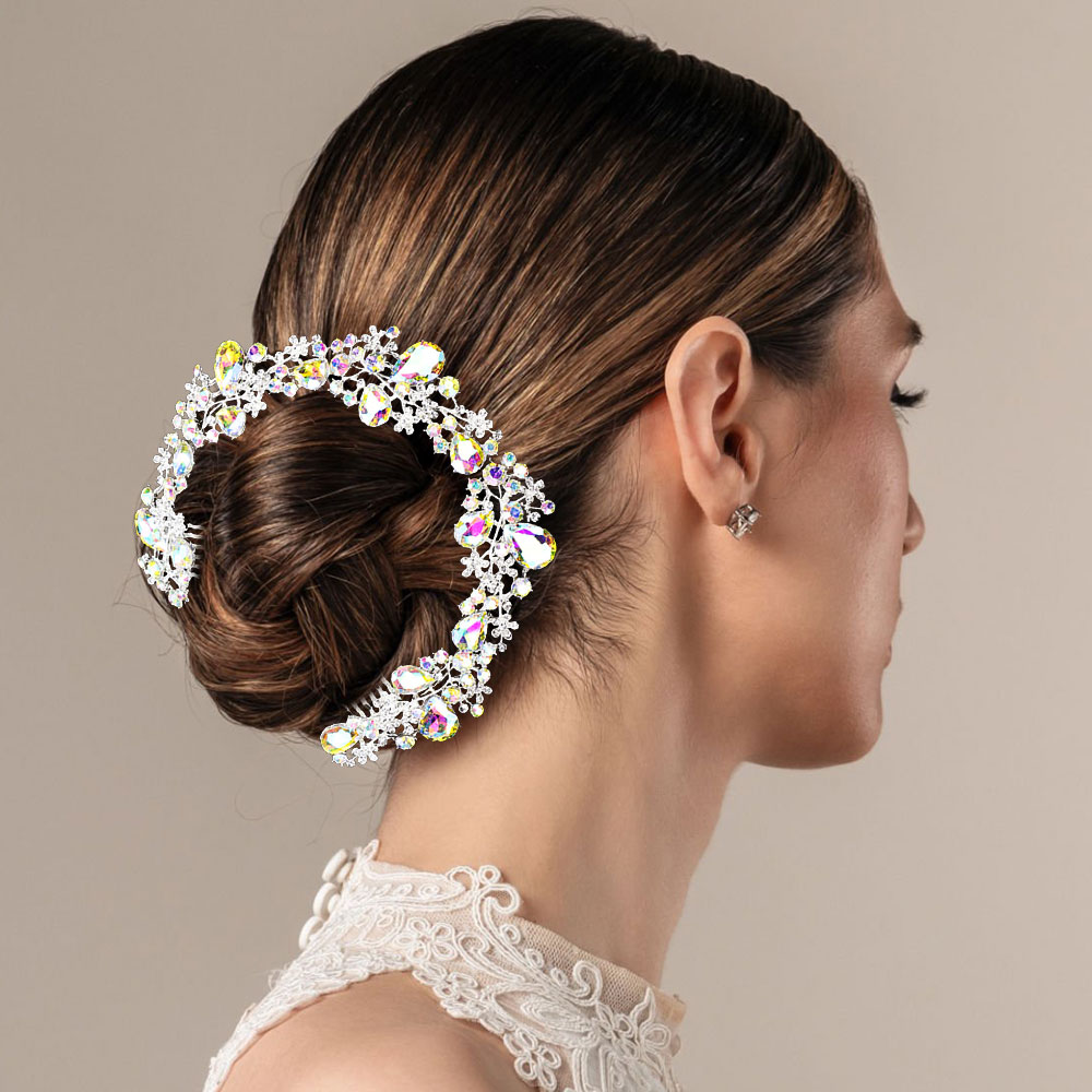 Details • Size : 1.25" X 12" • A Pair Bobbi Pin Included • Sophisticated floral crystal hair wrap designed to encircle elegant buns and updos. Ideal for bridal or formal looks, it delivers a refined sparkle and secure hold for special events and timeless style.