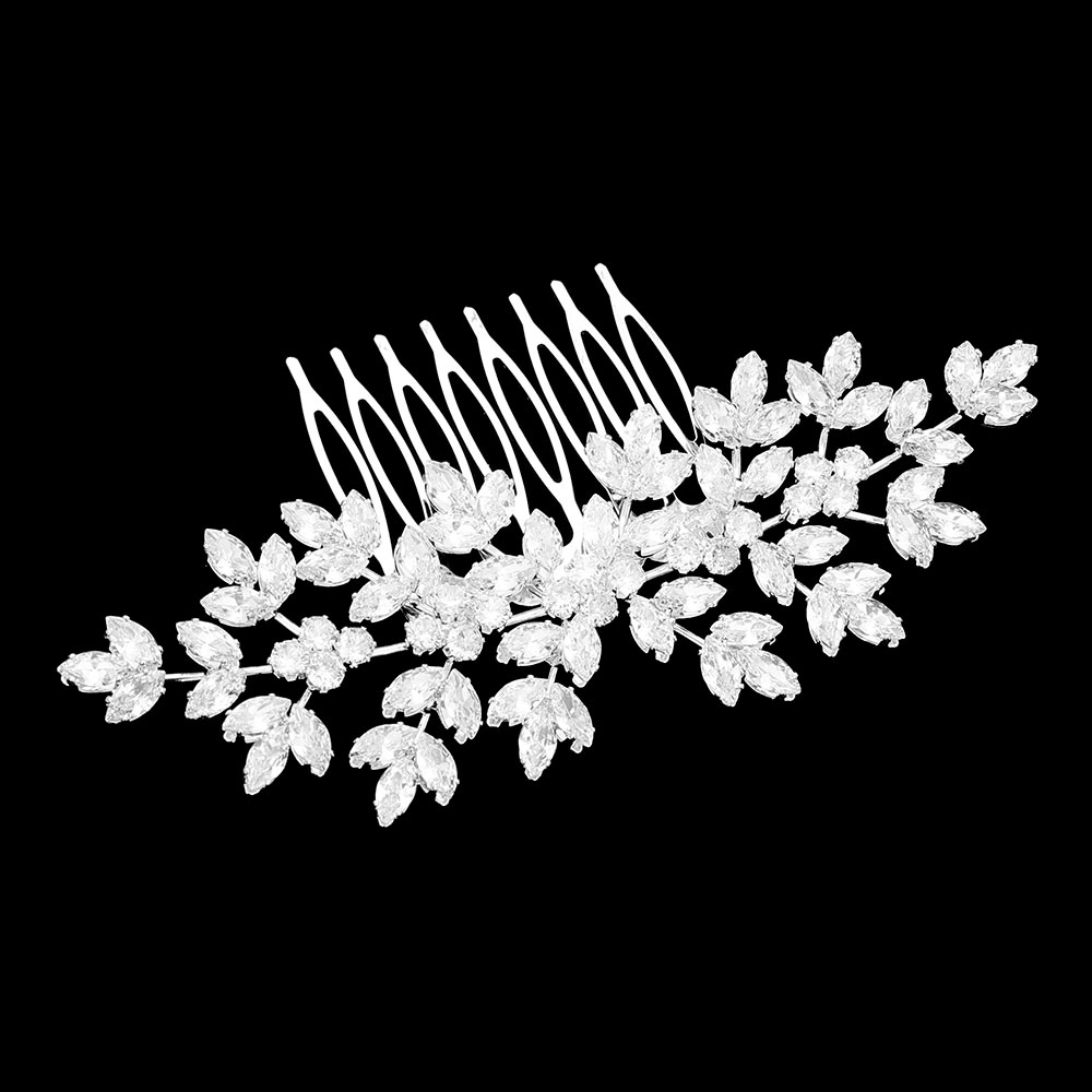 Details • Size : 4.5" X 1.5" • Elevate your hairstyle with this radiant leaf-inspired cz crystal hair comb, designed with layered branches that create a refined, sparkling silhouette. Perfect for weddings and special occasions, it offers secure placement and a graceful touch that enhances both classic and modern looks. • CZ Cubic Zirconia • Lead and Nickel Compliant
