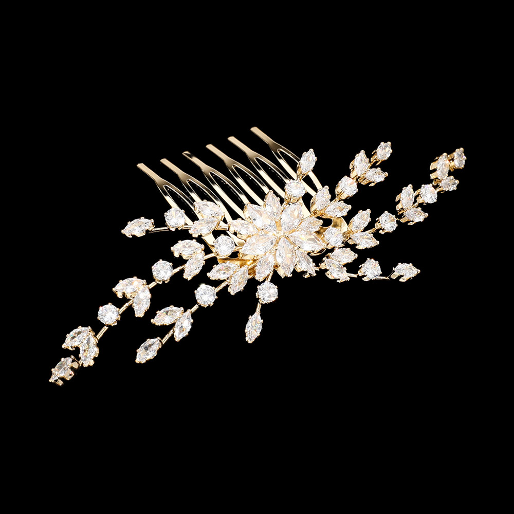 Details • Size : 4.25" X 1.25" • Delicate hair comb featuring an intricate crystal leaf design that adds a refined sparkle to any updo. Ideal for weddings, formal events, or romantic occasions, this elegant accessory offers a graceful finish to styled hair with timeless sophistication. • CZ Cubic Zirconia