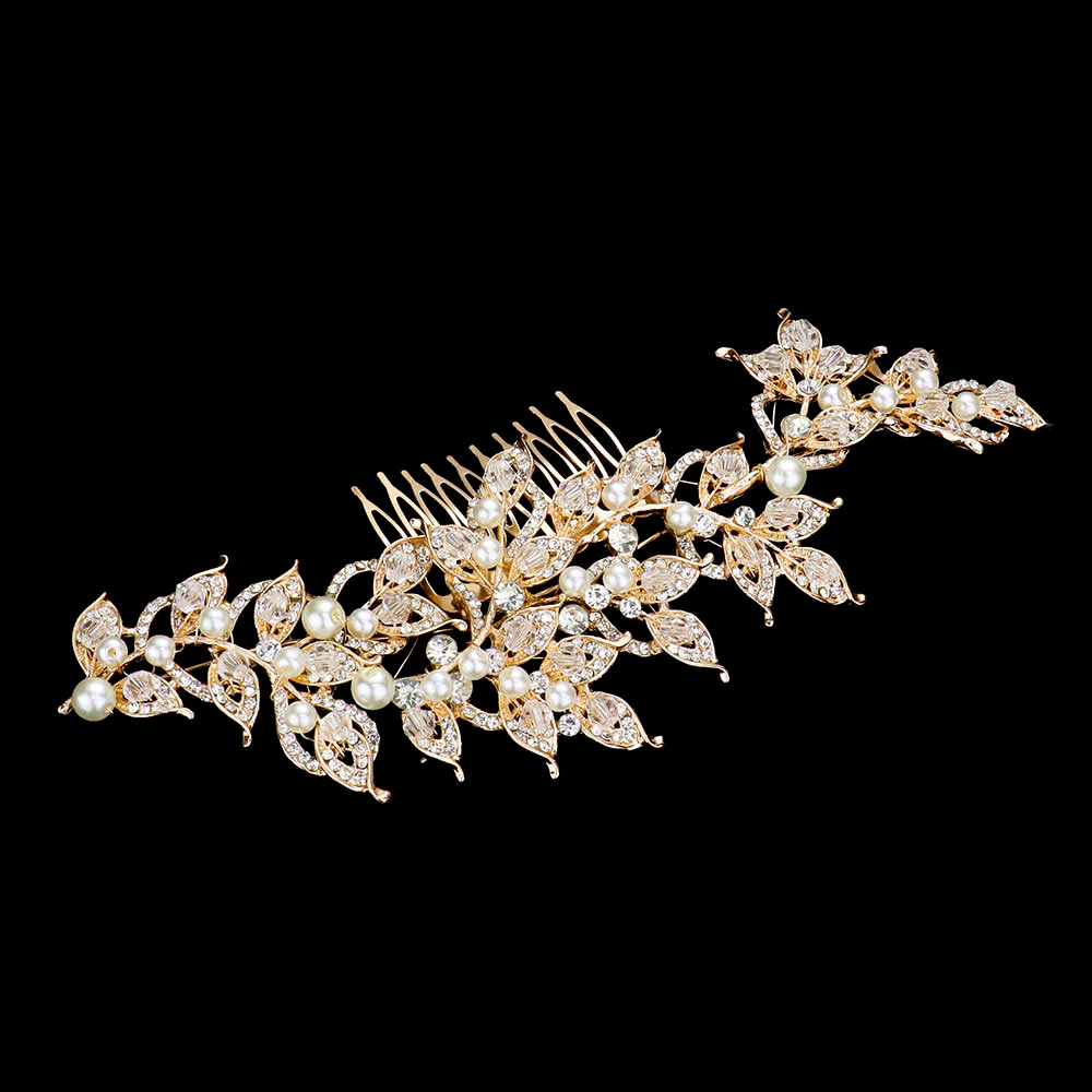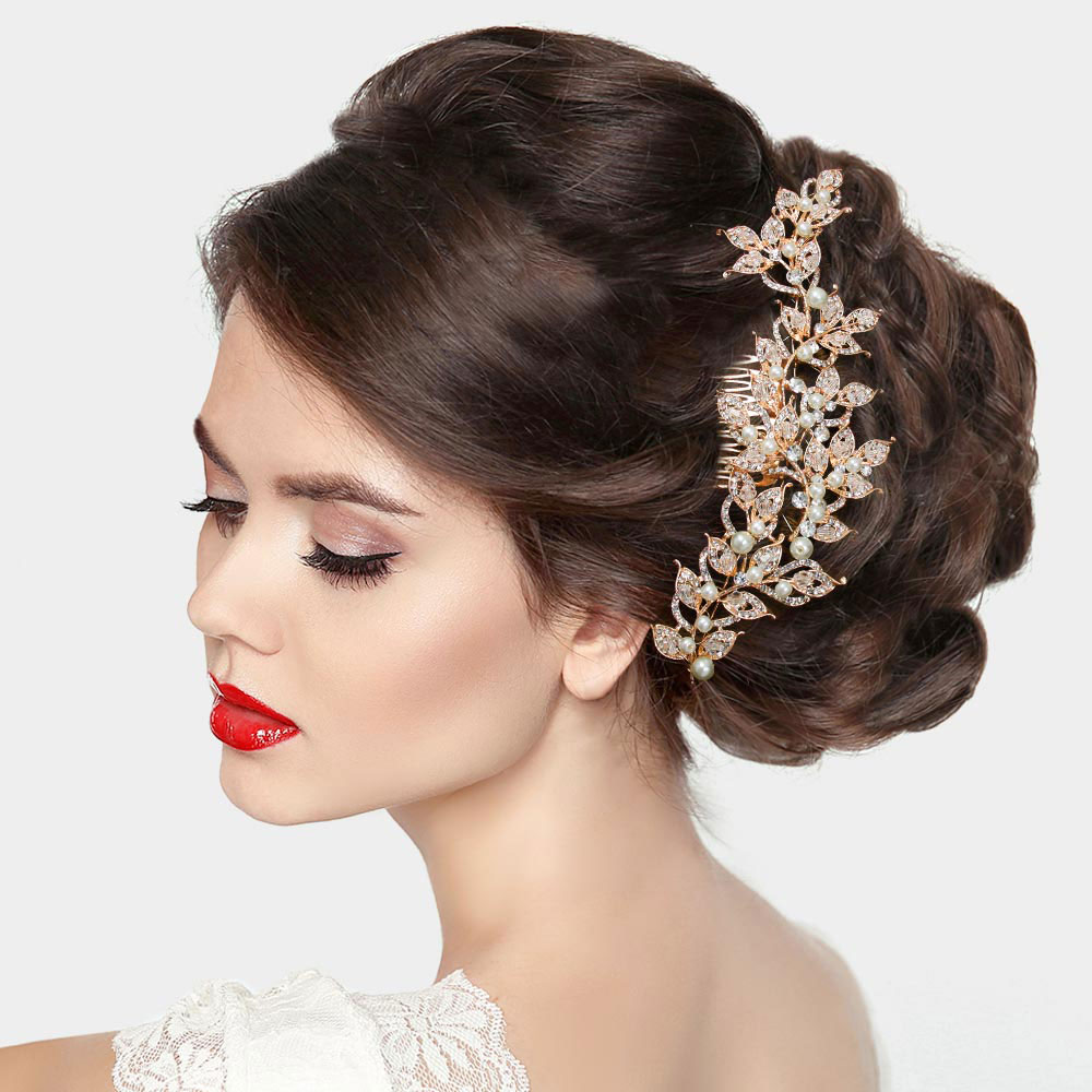 Details • Size : 8" X 2.5" • Graceful hair comb adorned with sparkling floral crystal accents, perfect for bridal and evening hairstyles. Designed to add a touch of elegance and charm to formal updos or romantic side-swept looks. • Lead and Nickel Compliant