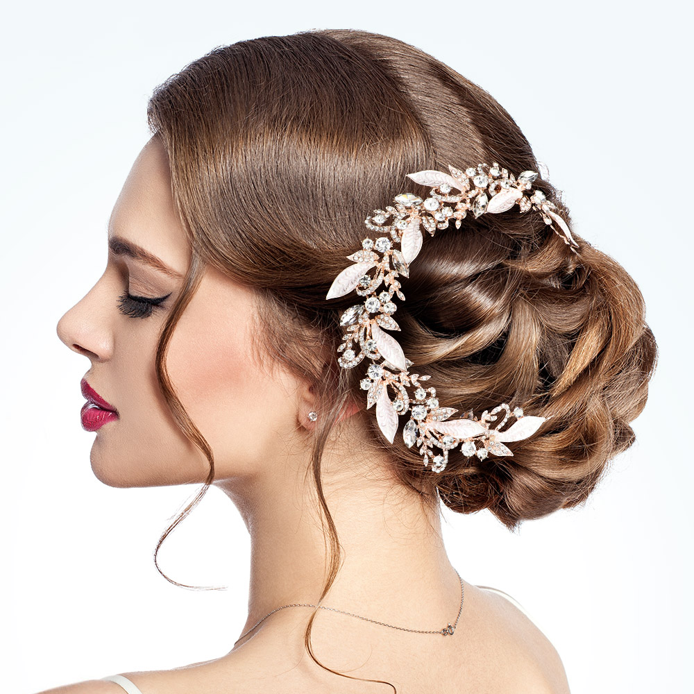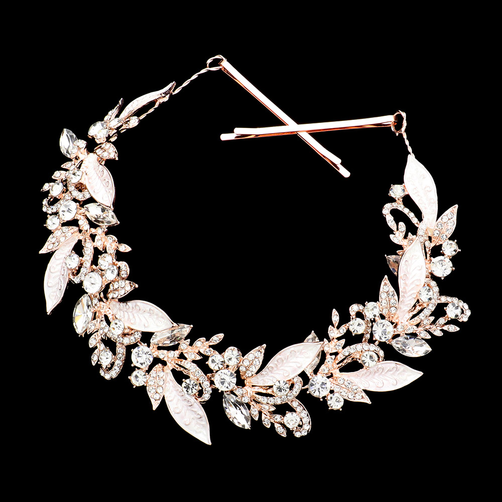 Details • Size : 11" X 1.25" • A Pair Bobby Pin and Sash Ribbon Included • Make a statement with this bold hair vine wrap featuring intricate leaf shapes and crystal-inspired details. Perfect for weddings, proms, or elegant events, it curves beautifully around buns and updos. A glamorous, flexible accessory that adds drama and sophistication.