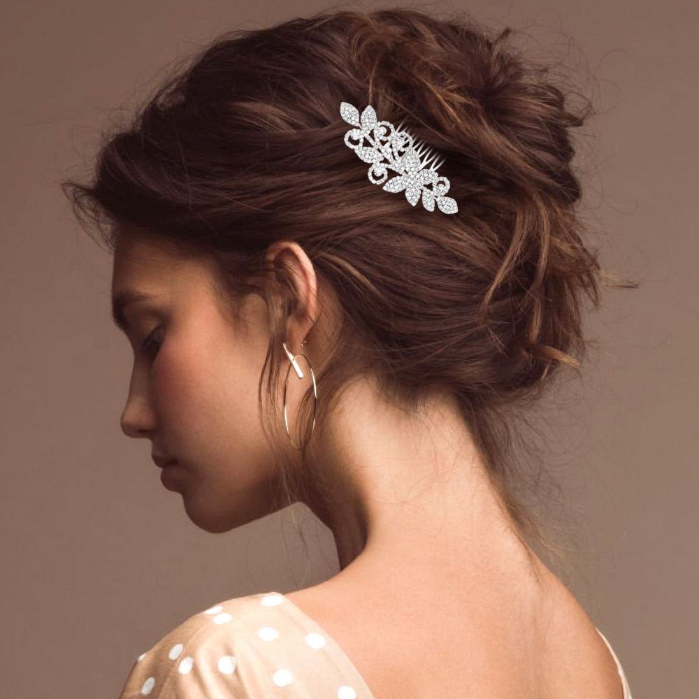 • This elegant floral hair comb features intricate rhinestone detailing that adds a sparkling touch to any hairstyle. Ideal for weddings, proms, or special occasions, it offers a secure hold and timeless charm.