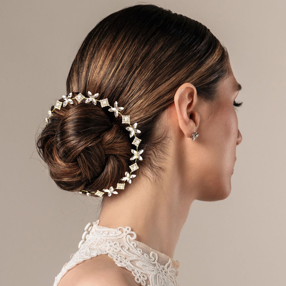 Details • Size : 11" X 0.5" • A Pair Bobbi Pin Included • Elegant circular hair accessory with sparkling flower crystals, perfect for updos and bridal hairstyles. Lightweight and easy to secure, adds graceful charm to any formal or wedding look.