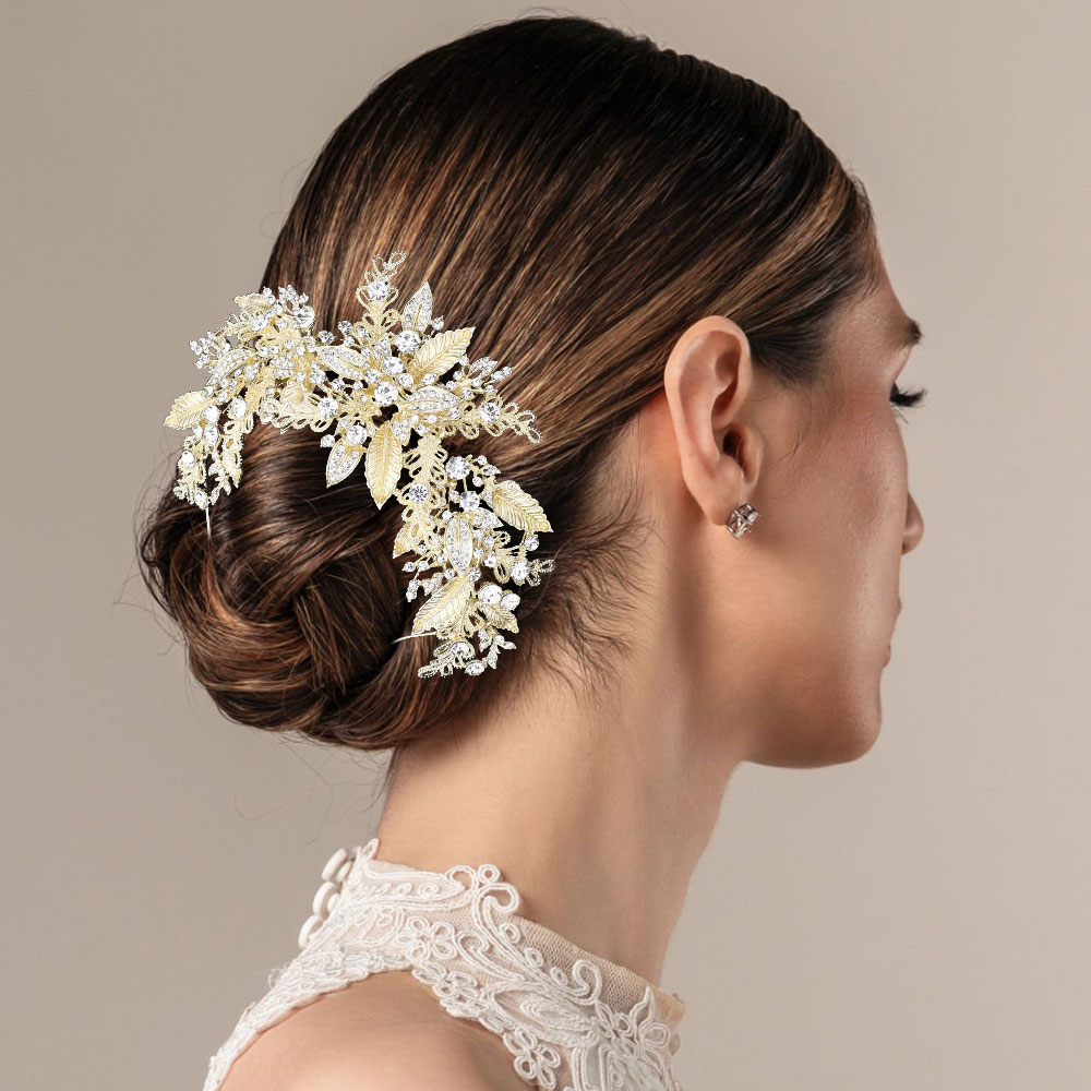 • Graceful floral hairpiece featuring delicate leaf and bead detailing arranged in a natural, cascading design. Perfect for bridal or formal styles, this accessory enhances updos with a romantic, nature-inspired elegance that complements a variety of special occasion looks.