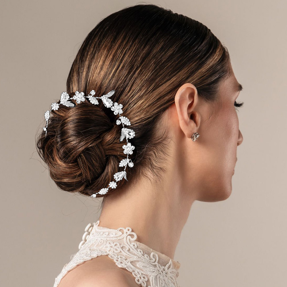 Details • Size : 11" X 0.75" • A Pair Bobbi Pin Included • Delicate floral hair wreath featuring sparkling rhinestones and leaf accents, designed to encircle elegant bridal buns. Perfect for weddings or formal occasions, adding a romantic and graceful touch. • Lead and Nickel Compliant