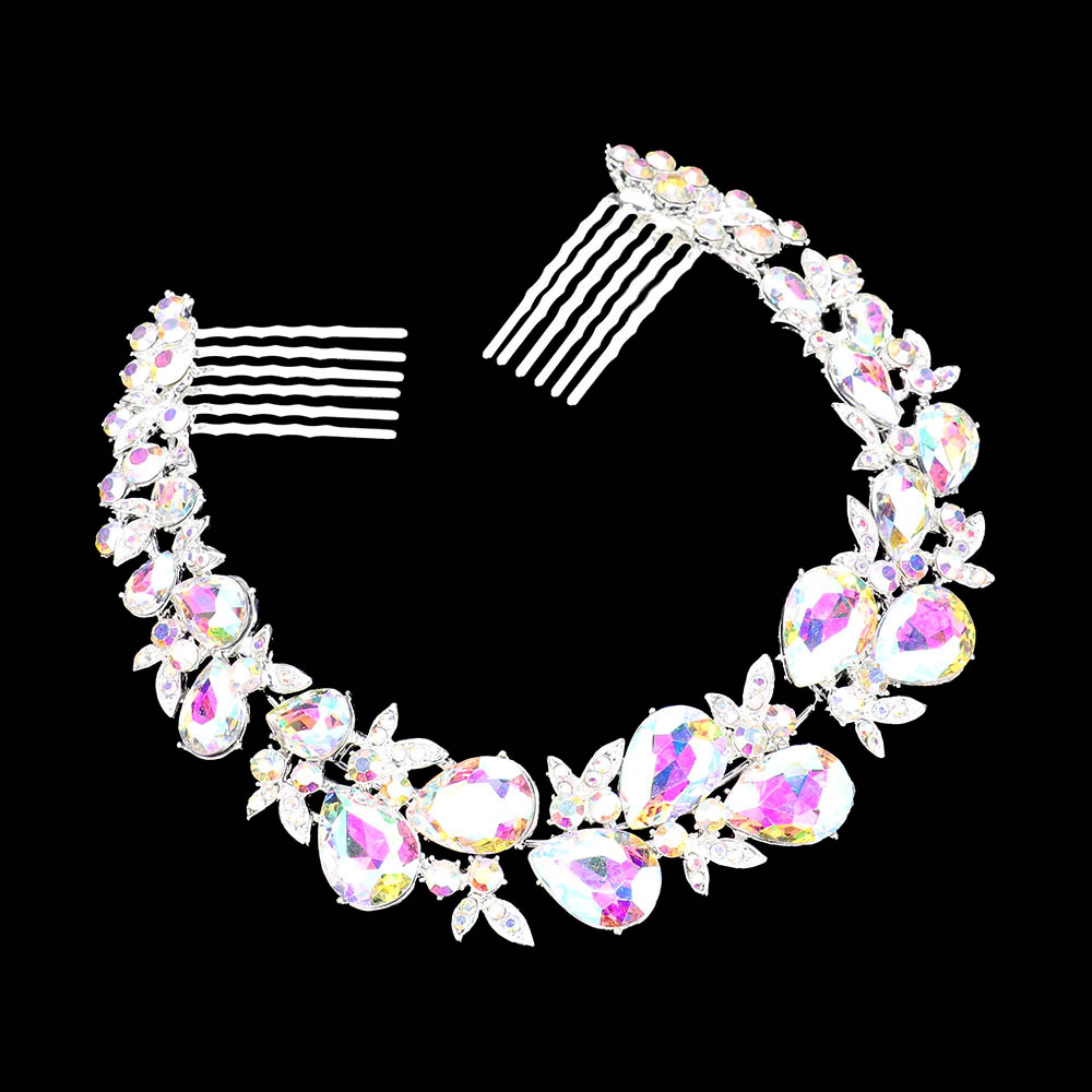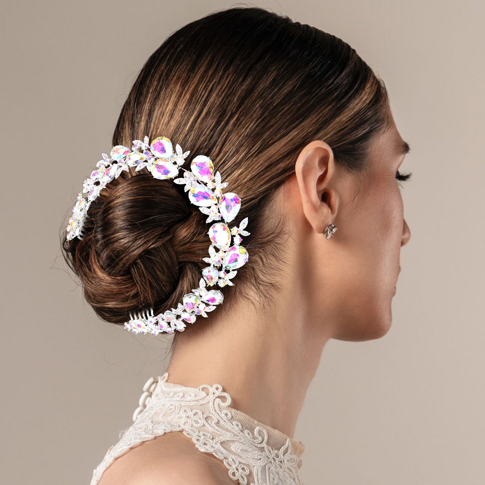 Details • Size : 11" X 1" • A Pair Bobbi Pin Included • Elegant hair wreath adorned with shimmering teardrop crystals and intricate leaf accents, designed to wrap around bridal buns. A stunning accessory for weddings, adding sparkle and refined beauty. • Lead and Nickel Compliant