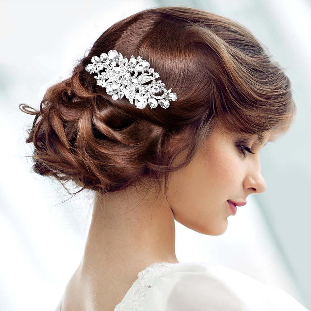 • Elegant floral hair clip with sparkling crystal accents, perfect for enhancing bridal, prom, or evening hairstyles. Adds sophisticated charm and glamour to any special occasion updo or formal look.