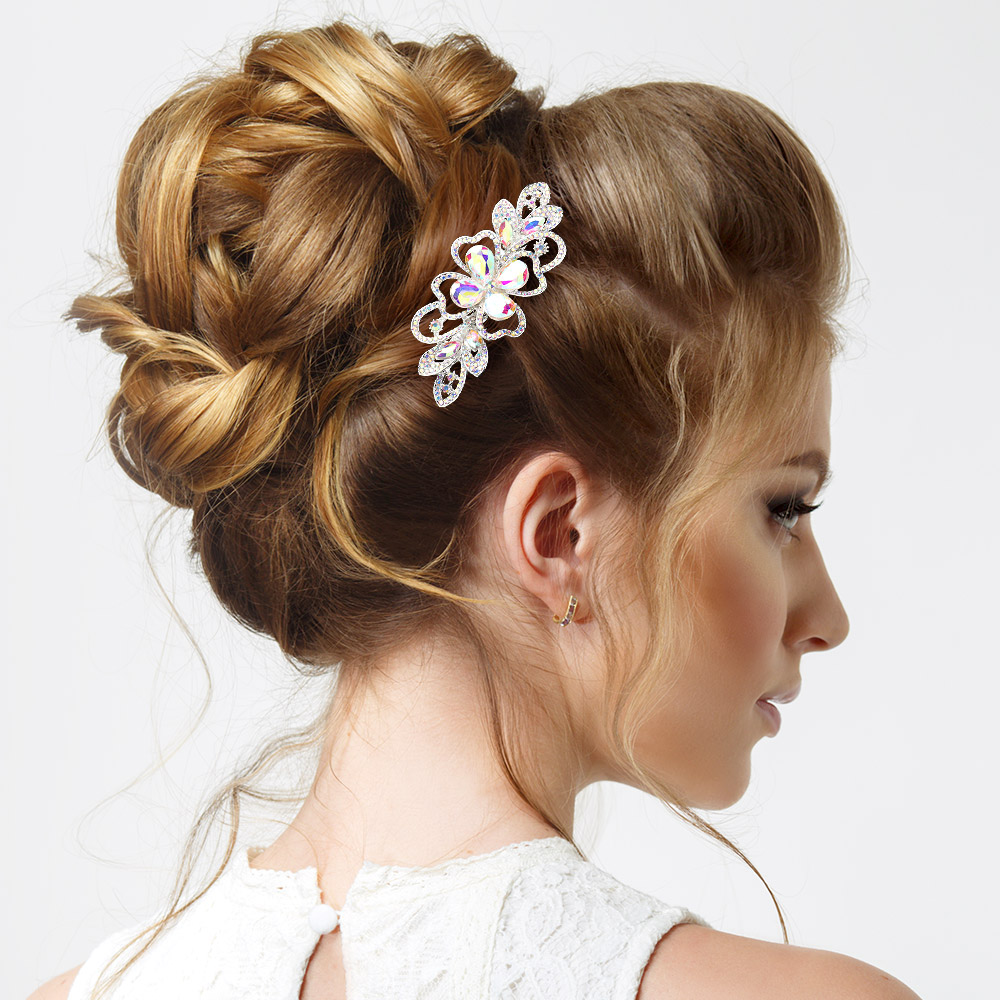 Details • Size : 3.5" X 1.5" • Complete your formal hairstyle with this graceful floral hair clip designed to add a refined, eye-catching touch to updos and swept-back looks. Its intricate detailing creates a polished finish, making it ideal for weddings, celebrations, and timeless photo-ready styles.