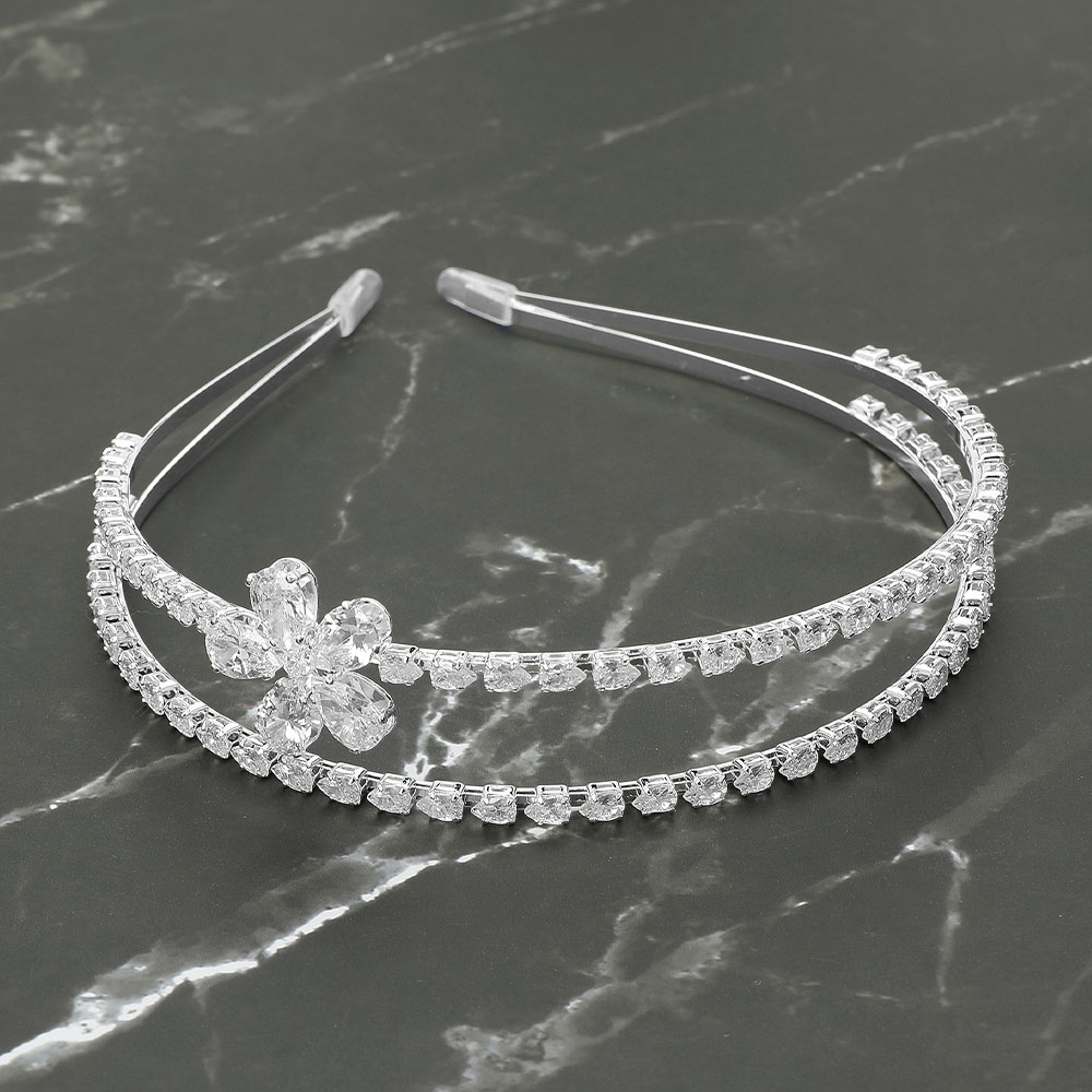 Details • Size : 1.4" H • Chic headband featuring a double row of crystals and a floral accent for a graceful, eye-catching look. Ideal for formal events, bridal wear, or elegant evenings. Secure and comfortable fit for all-day shine. • CZ Cubic Zirconia