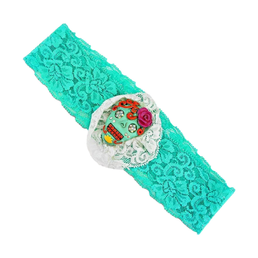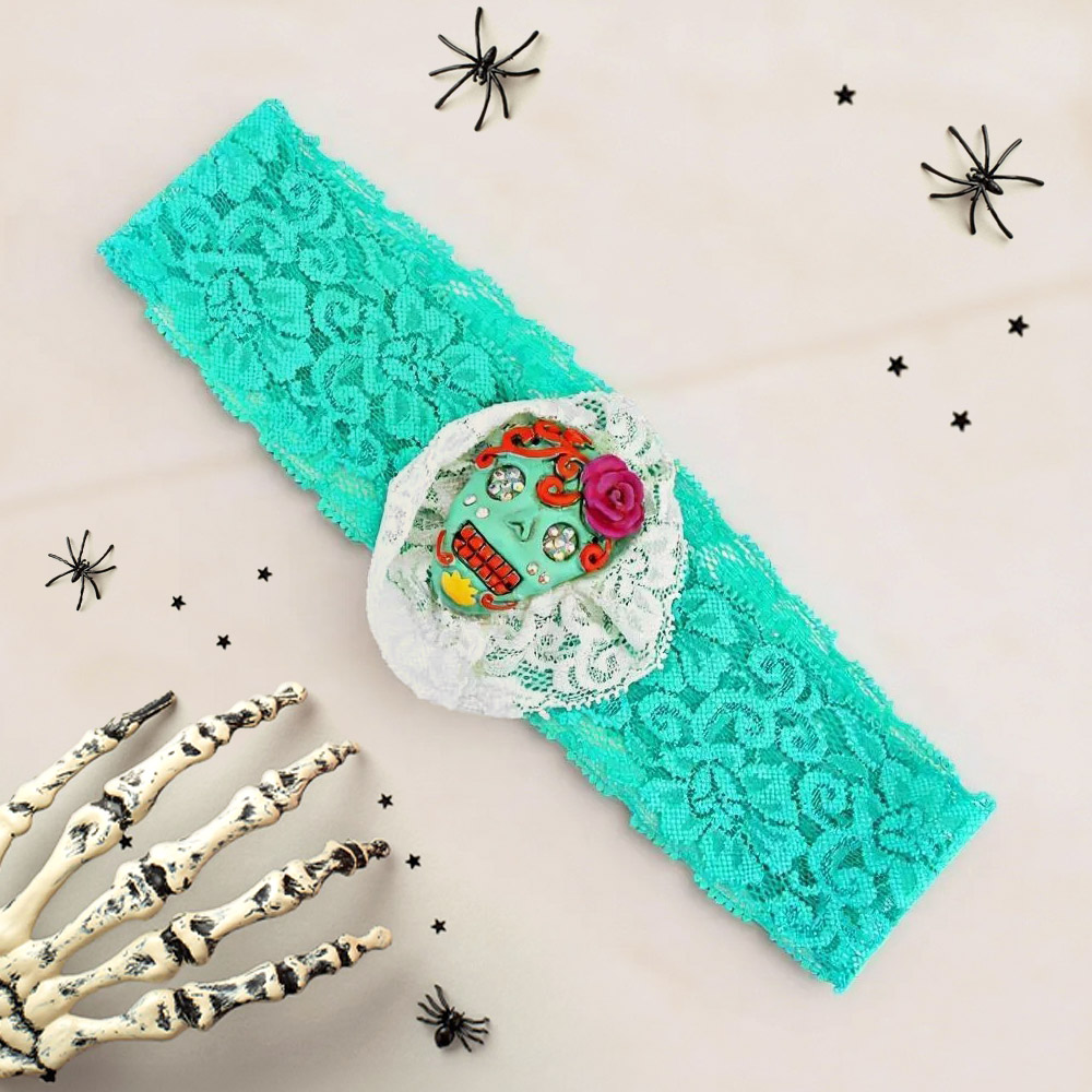• Add flair to your look with this lace headband featuring a sugar skull centerpiece and floral accents. Stretchy and stylish, perfect for themed parties, festivals, or Day of the Dead celebrations.