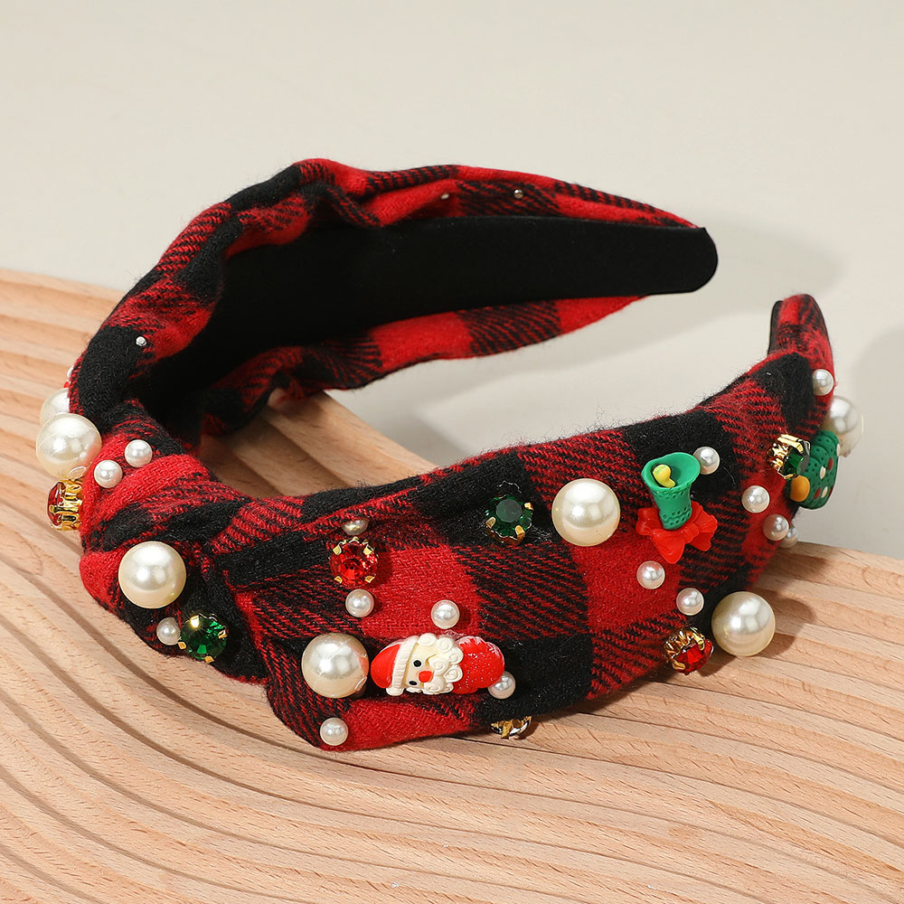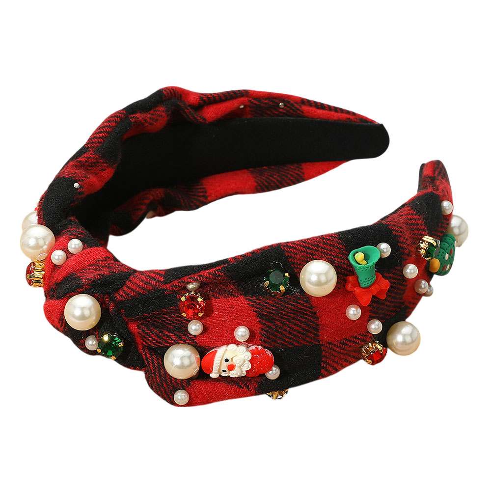 Holiday Festival Charm Pearl Embellished Plaid Knot Headband