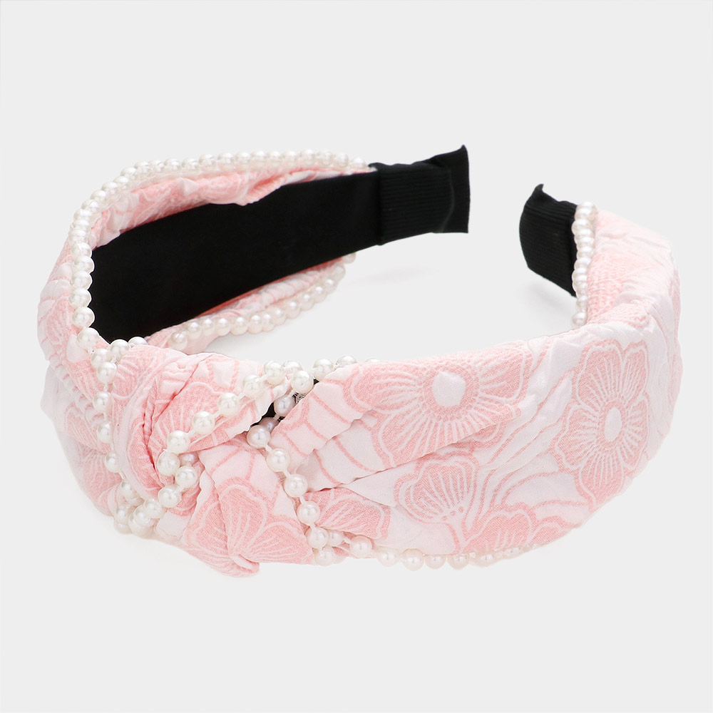 Pearl Embellished Flower Patterned Knot Burnout Headband