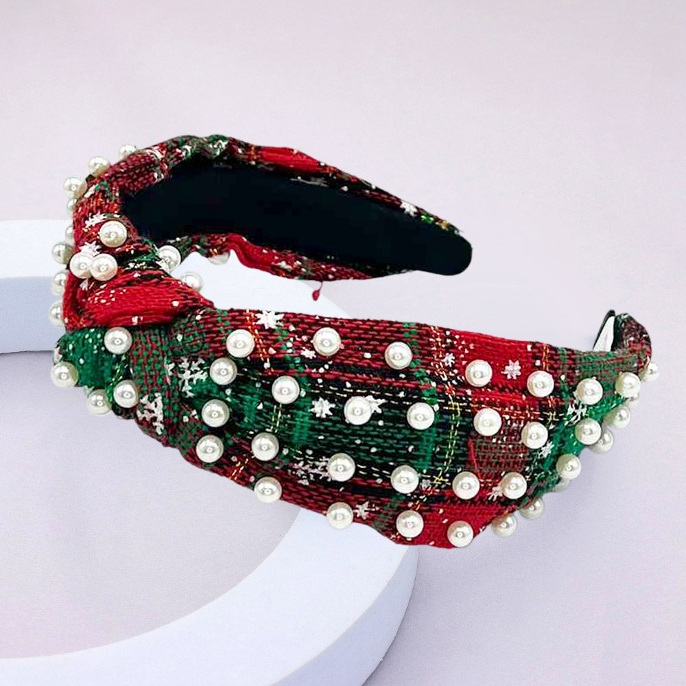 • Holiday plaid headband decorated with pearls and festive accents. A charming accessory to complete your Christmas party look and bring a cheerful seasonal vibe to your winter outfits.