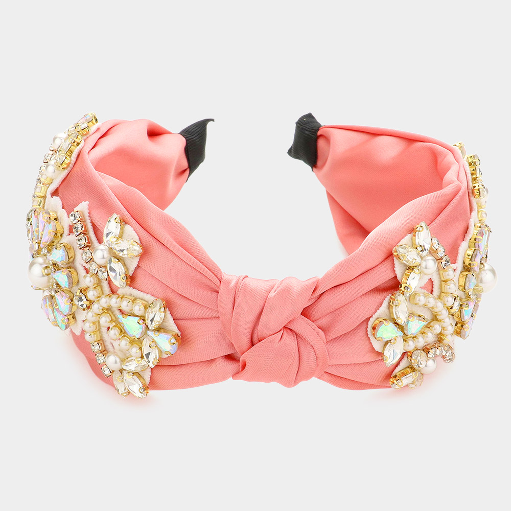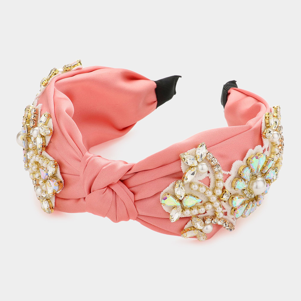 Pearl Stone Embellished Flower Burnout Knot Headband