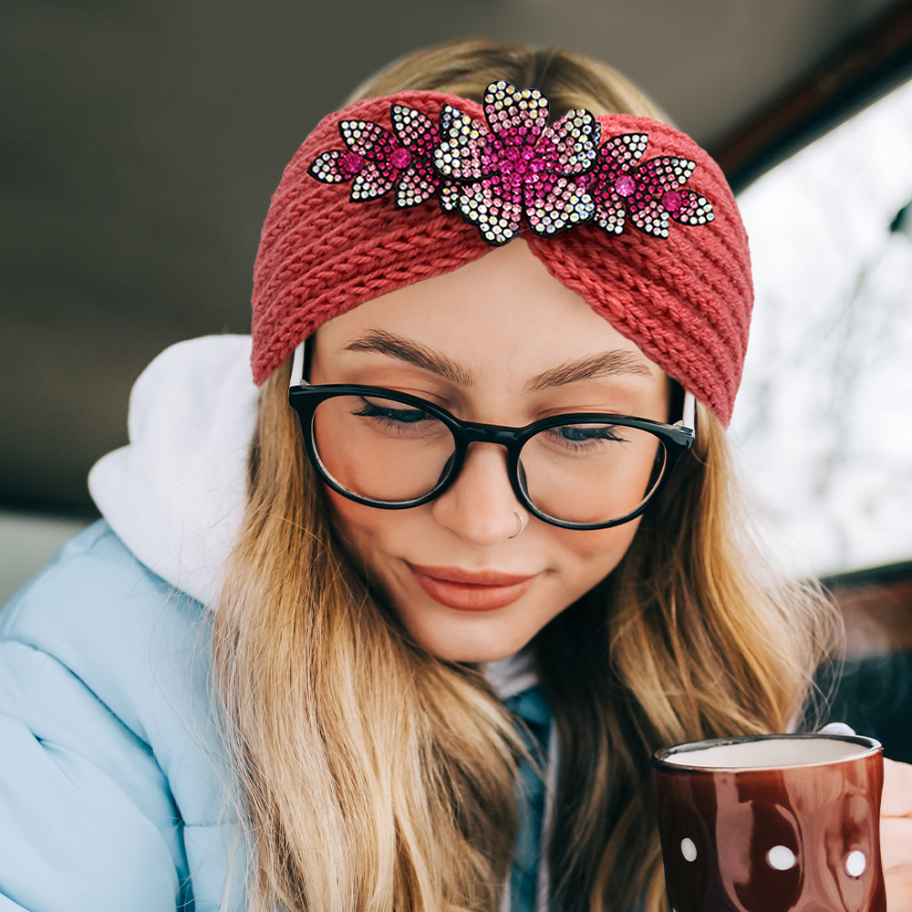 Rhinestone Flower Bling Pointed Knit Earmuff Headband
