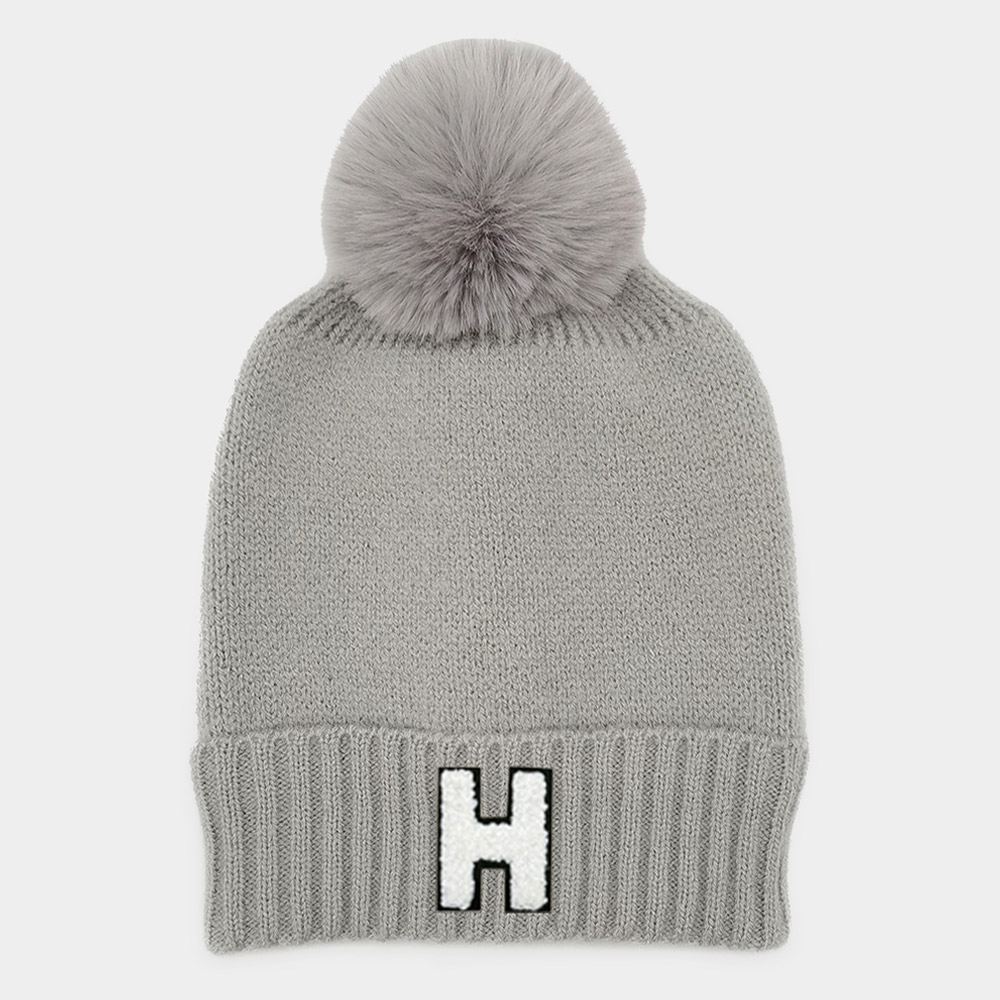 -H- Initial Monogram Faux Fur Pom Pom Knit Beanie Hat