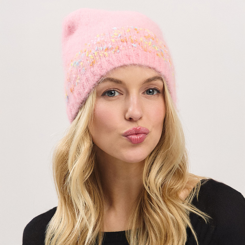 Details • Size : One Size • Material : 64% Acrylic, 26% Nylon, 8% Wool, 2% Spandex • Stay stylish and warm with this textured knit beanie featuring a soft finish and a vibrant multicolor accent stripe. Perfect for adding subtle flair to your winter look, it offers a cozy fit and standout detail. A unique cold-weather accessory for everyday comfort and personality.