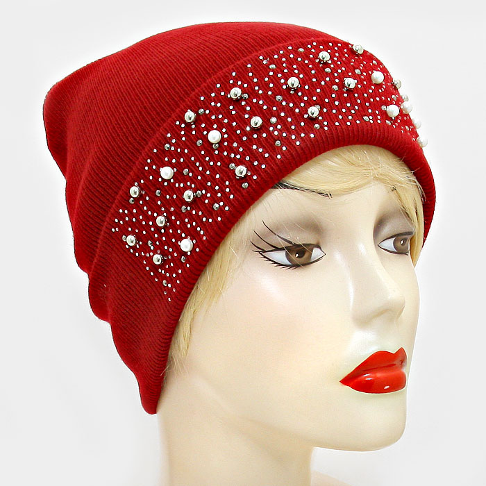 Pearl Crystal Metal Ball Cluster Beanie Hat