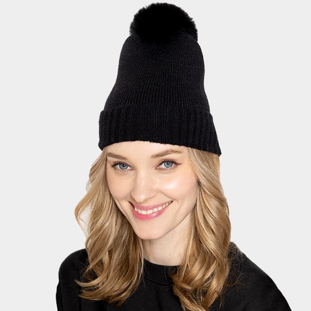 -C- Initial Monogram Faux Fur Pom Pom Knit Beanie Hat
