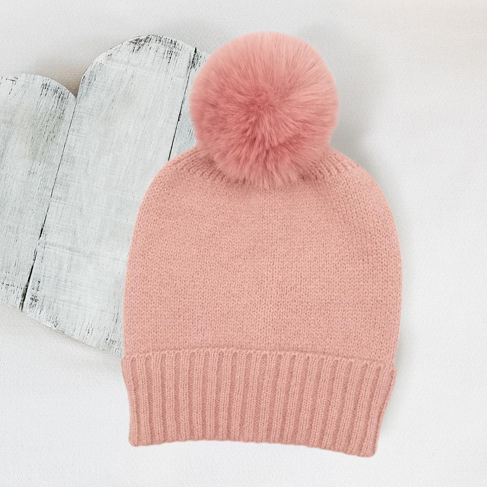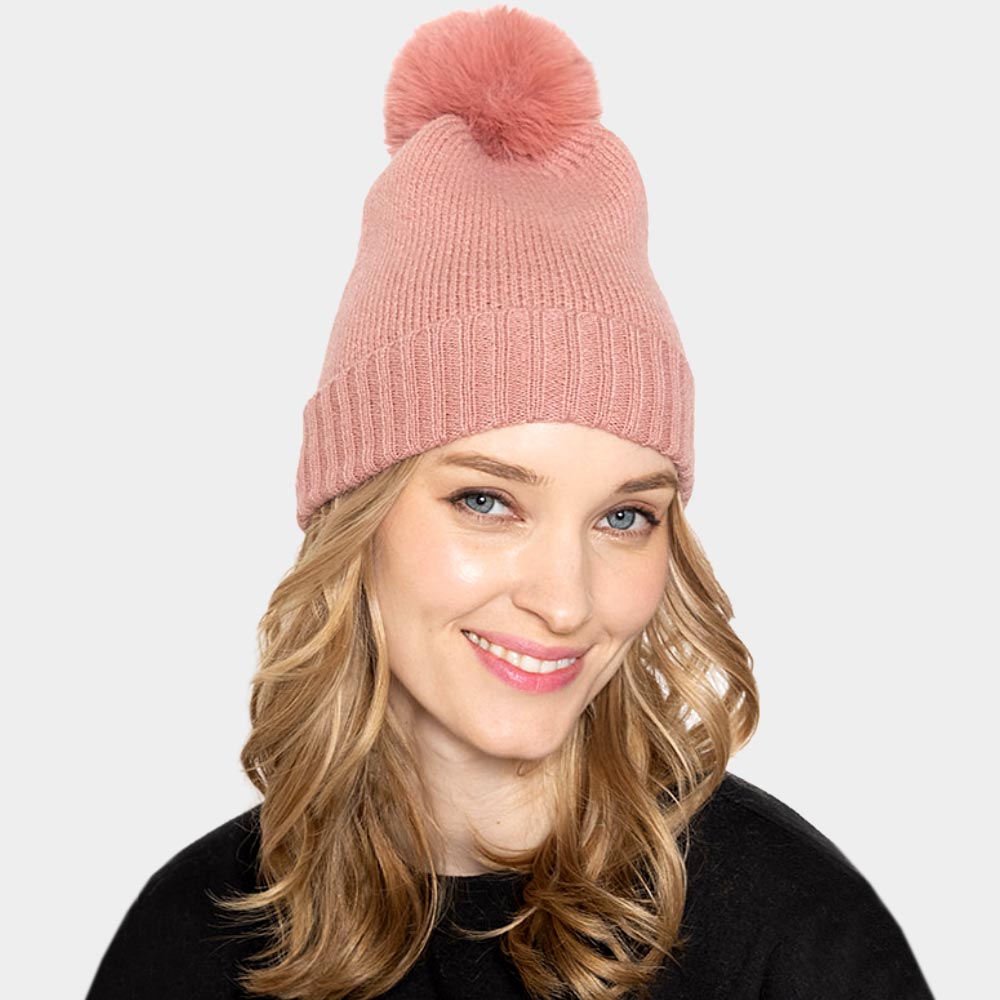 Solid Knit Faux Fur Pom Pom Beanie Hat