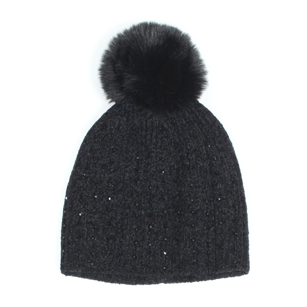 Stone Embellished Chenille Pom Pom Beanie Hat