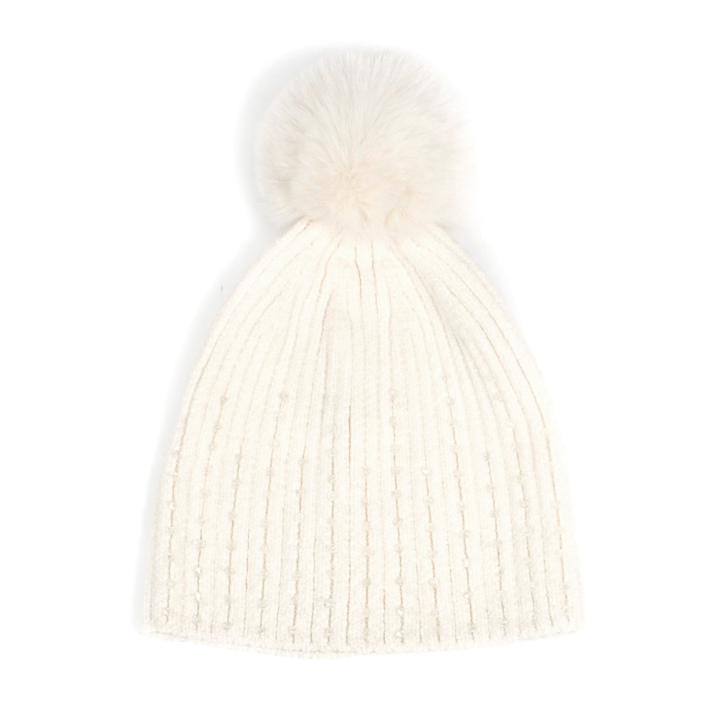 Stone Embellished Chenille Pom Pom Beanie Hat