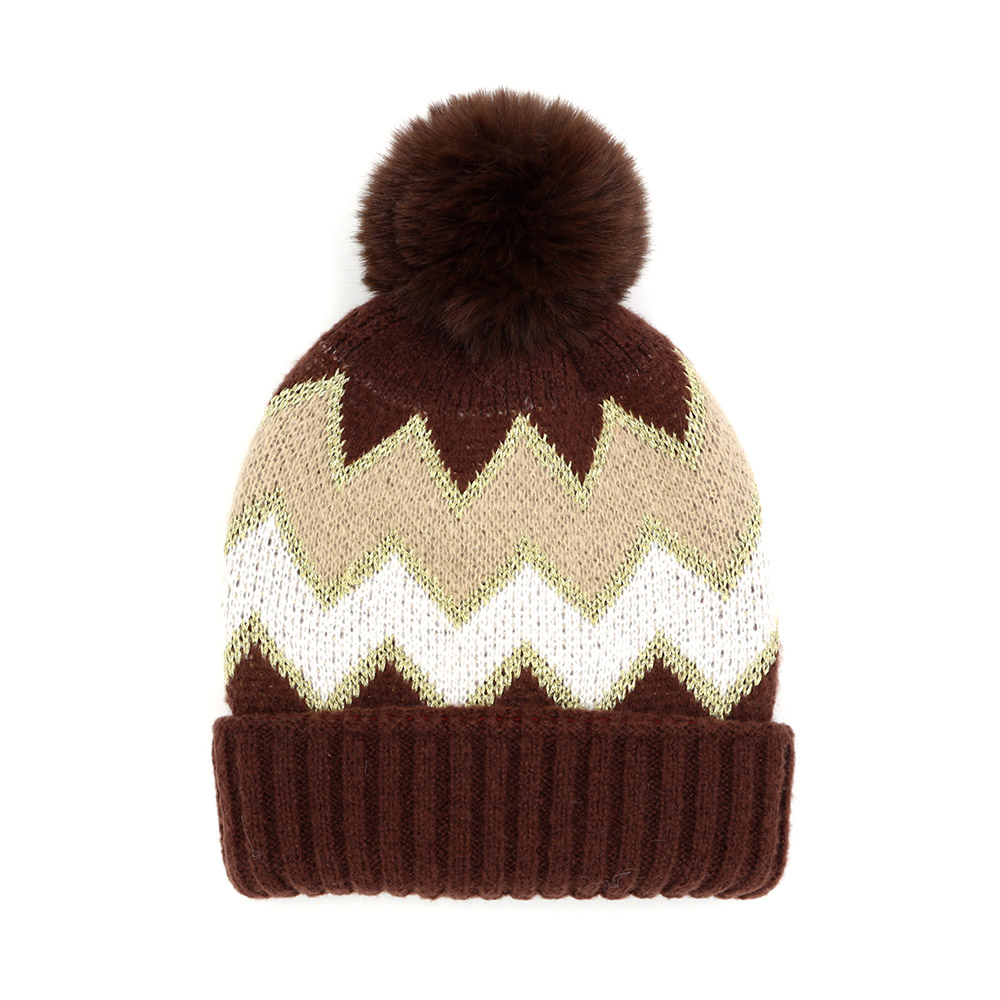 Zigzag Chevron Patterned Fuzzy Fleece Pom Pom Beanie Hat
