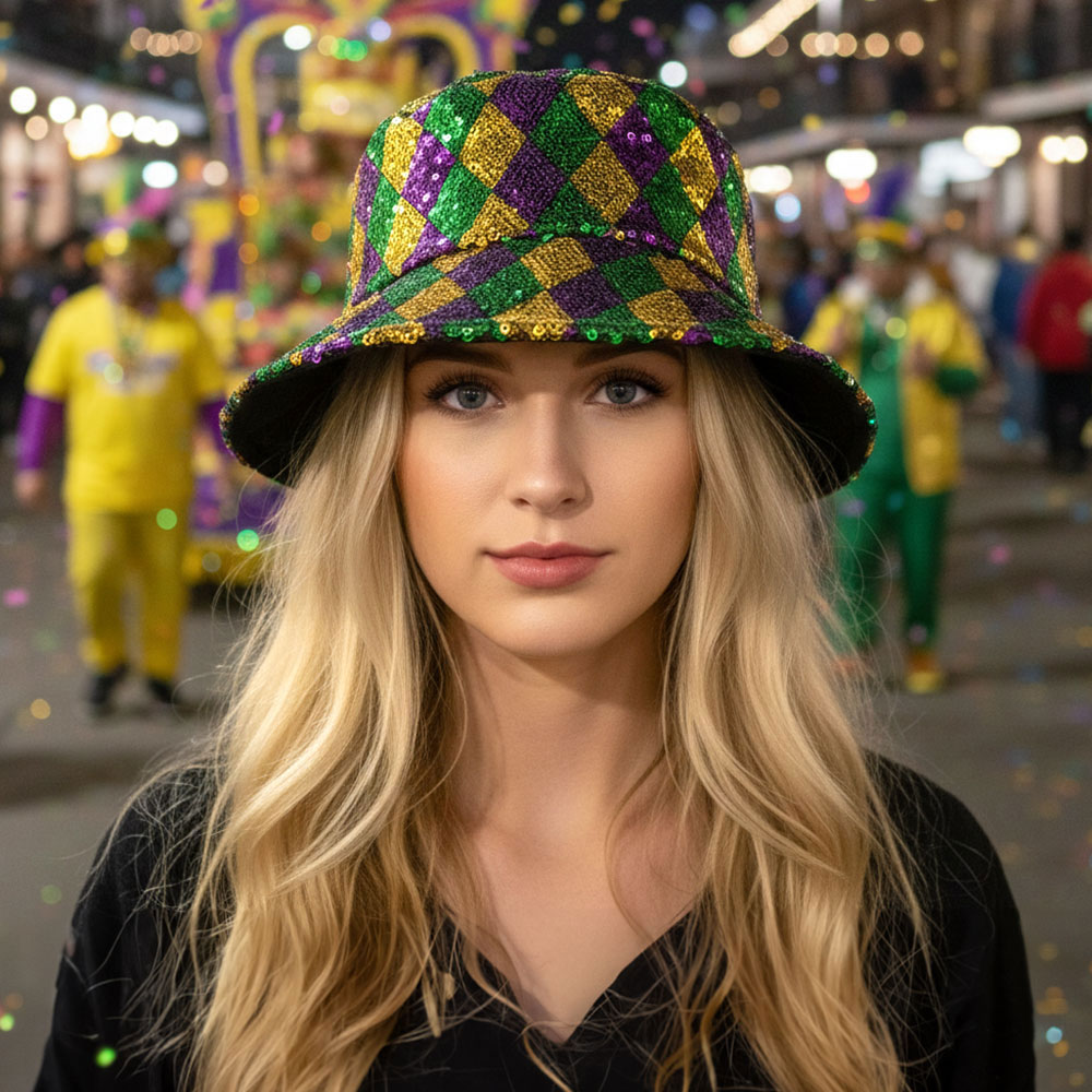 Details • Size : One Size • Add statement style with this sequin diamond pattern mardi gras bucket hat featuring a bold geometric design and classic bucket silhouette. Comfortable for all-day wear and easy to style, it’s ideal for festivals, concerts, themed events, or casual outfits that need a playful, standout finishing touch.