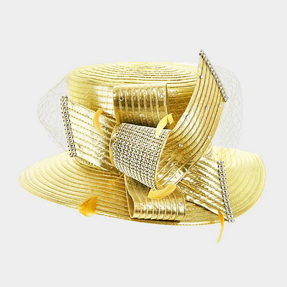 Feather Crystal Detail Bow Mesh Metallic Satin Dressy Hat