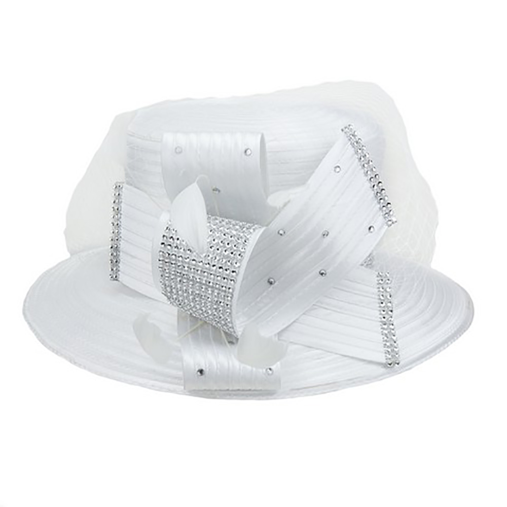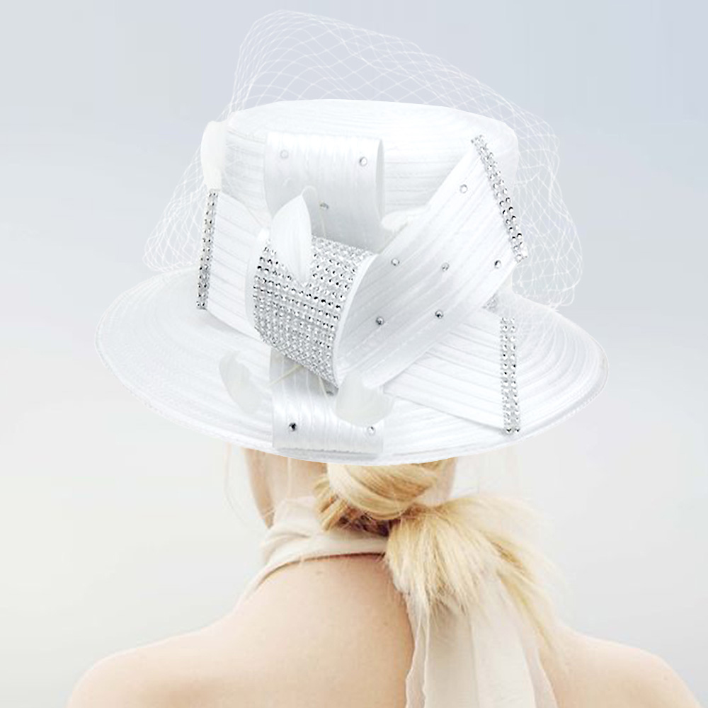 Details • Size : One Size • Step out in elegance with this white wide brim hat featuring a sparkling rhinestone bow and soft mesh veil accent. Ideal for church, weddings, and special occasions, this refined design blends timeless style with graceful details, making it the perfect statement piece for formal events.