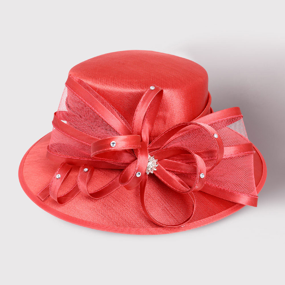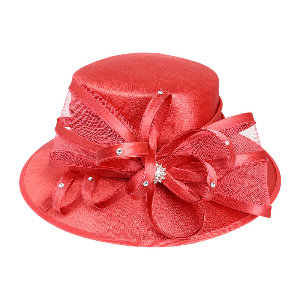 Details • Crown Circumference : 23" • Crown Height : 3.5" • Brim Height : 3.5" • Material : 100% Polyester • Make a statement with this striking red wide brim hat featuring layered ribbon bow details and a sparkling rhinestone accent. Perfect for church, weddings, tea parties, and formal gatherings, this elegant design adds timeless charm and sophistication to any special occasion outfit.