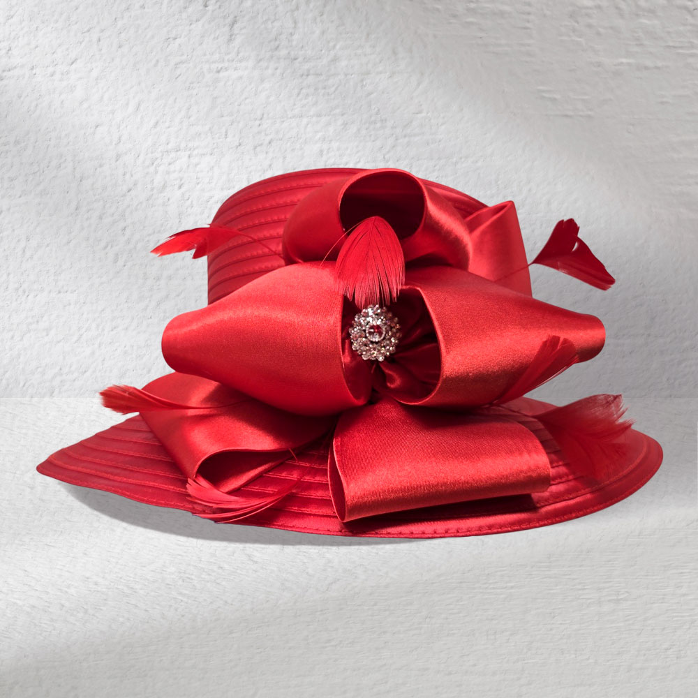 Details • Crown Circumference : 23" • Crown Height : 4" • Brim Height : 3.75" • Material : 100% Polyester • Turn heads with this stunning wide brim dress hat featuring a dramatic bow, elegant feather details, and a sparkling rhinestone centerpiece. Perfect for church, weddings, or special events, this hat adds timeless sophistication to any outfit.