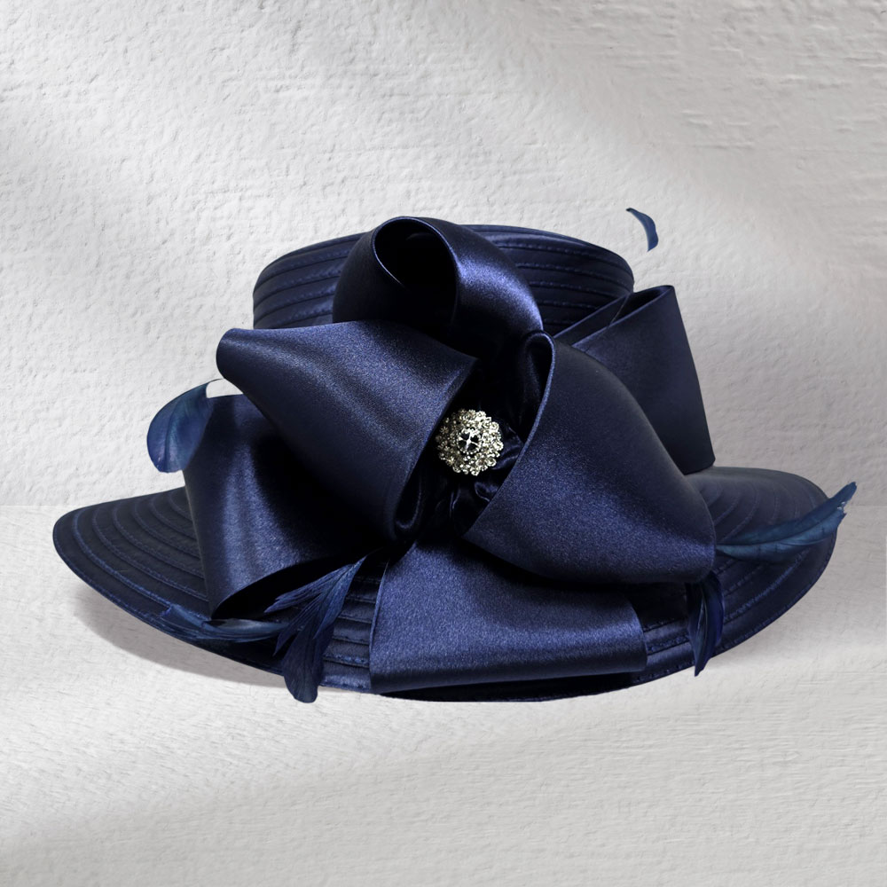Details • Crown Circumference : 23" • Crown Height : 4" • Brim Height : 3.75" • Material : 100% Polyester • Turn heads with this stunning wide brim dress hat featuring a dramatic bow, elegant feather details, and a sparkling rhinestone centerpiece. Perfect for church, weddings, or special events, this hat adds timeless sophistication to any outfit.