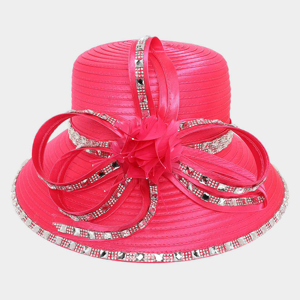 Rhinestone Rim Embellished Flower Bow Pointed Dressy Hat