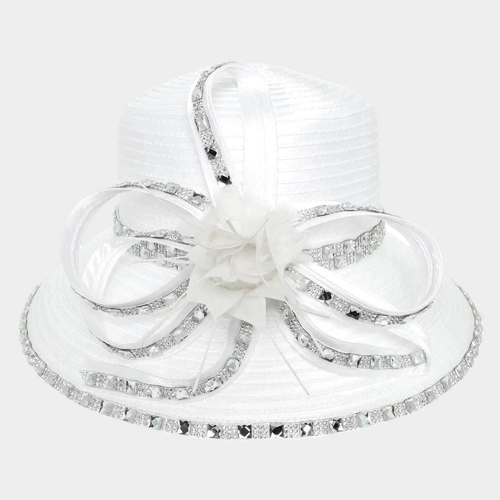 Rhinestone Rim Embellished Flower Bow Pointed Dressy Hat