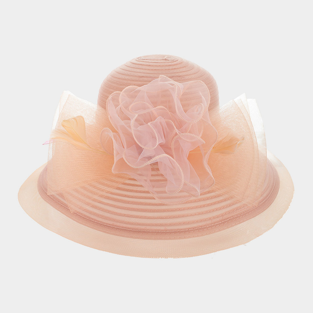 Rhinestone Rim Bow Top Feather Accented Mesh Dressy Hat