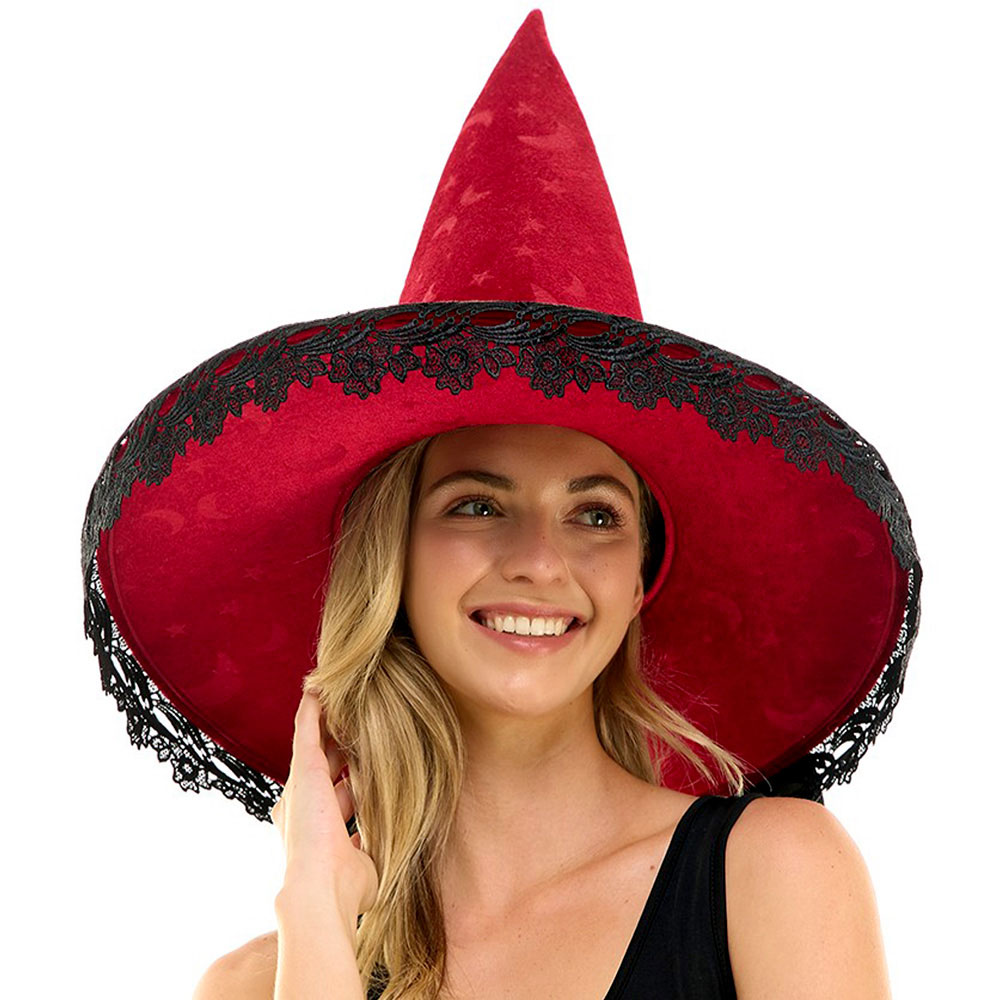 Details • Size : One Size • Add a touch of gothic elegance to your costume with this tall witch hat, featuring celestial patterns, a satin bow, and a lace-trimmed brim. Ideal for Halloween and cosplay.