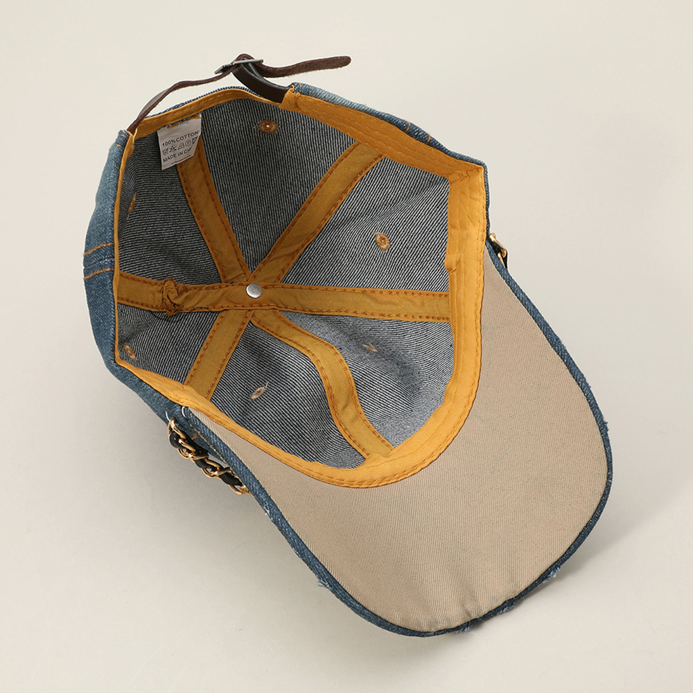 • Casual denim cap featuring a bold chain detail above the brim and shimmering embellishments. Perfect for adding edgy glam to your streetwear or everyday outfits.