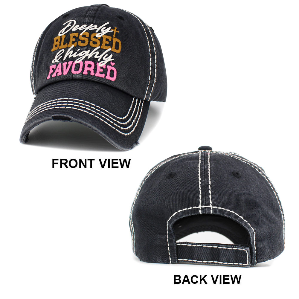Details • Crown Circumference : 23" (Adjustable) • Crown Height : 4.25" • Brim Height : 2.75" • Express faith and positivity with this distressed baseball cap featuring bold embroidery that reads “Deeply Blessed & Highly Favored.” Designed for comfort and style, it’s a perfect accessory for daily wear, uplifting your spirit while adding a casual yet meaningful touch.
