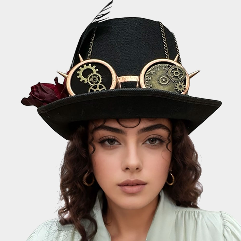 • Elegant steampunk top hat adorned with gear-themed goggles, spike accents, and chain detail. A bold accessory for costumes, cosplay events, or alternative fashion statements.