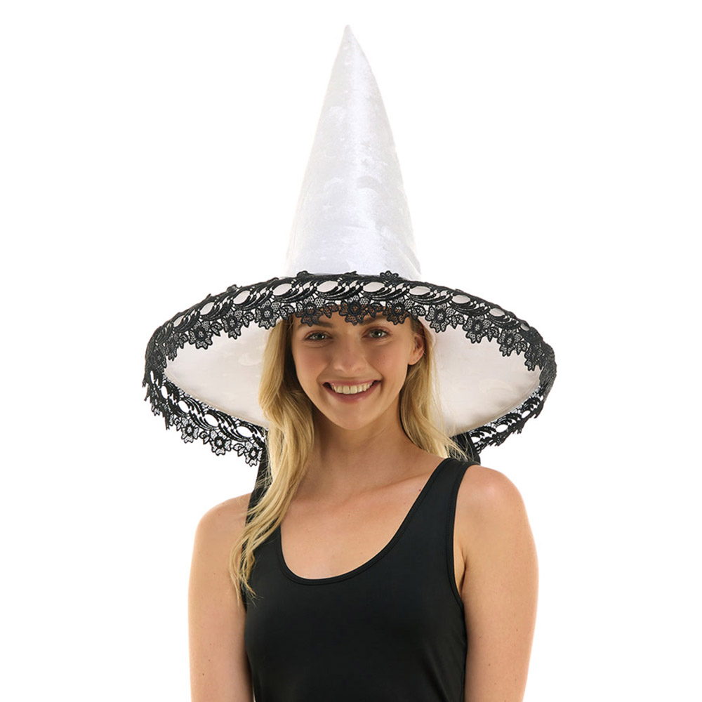 Details • Size : One Size • Pointed witch hat with ornate lace trim around the brim, ideal for Halloween costumes, fantasy events, or cosplay. Adds a sophisticated and enchanting touch to any magical ensemble.