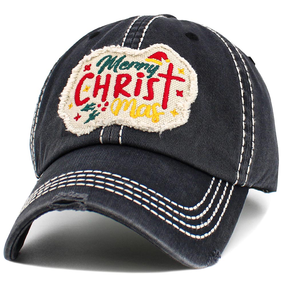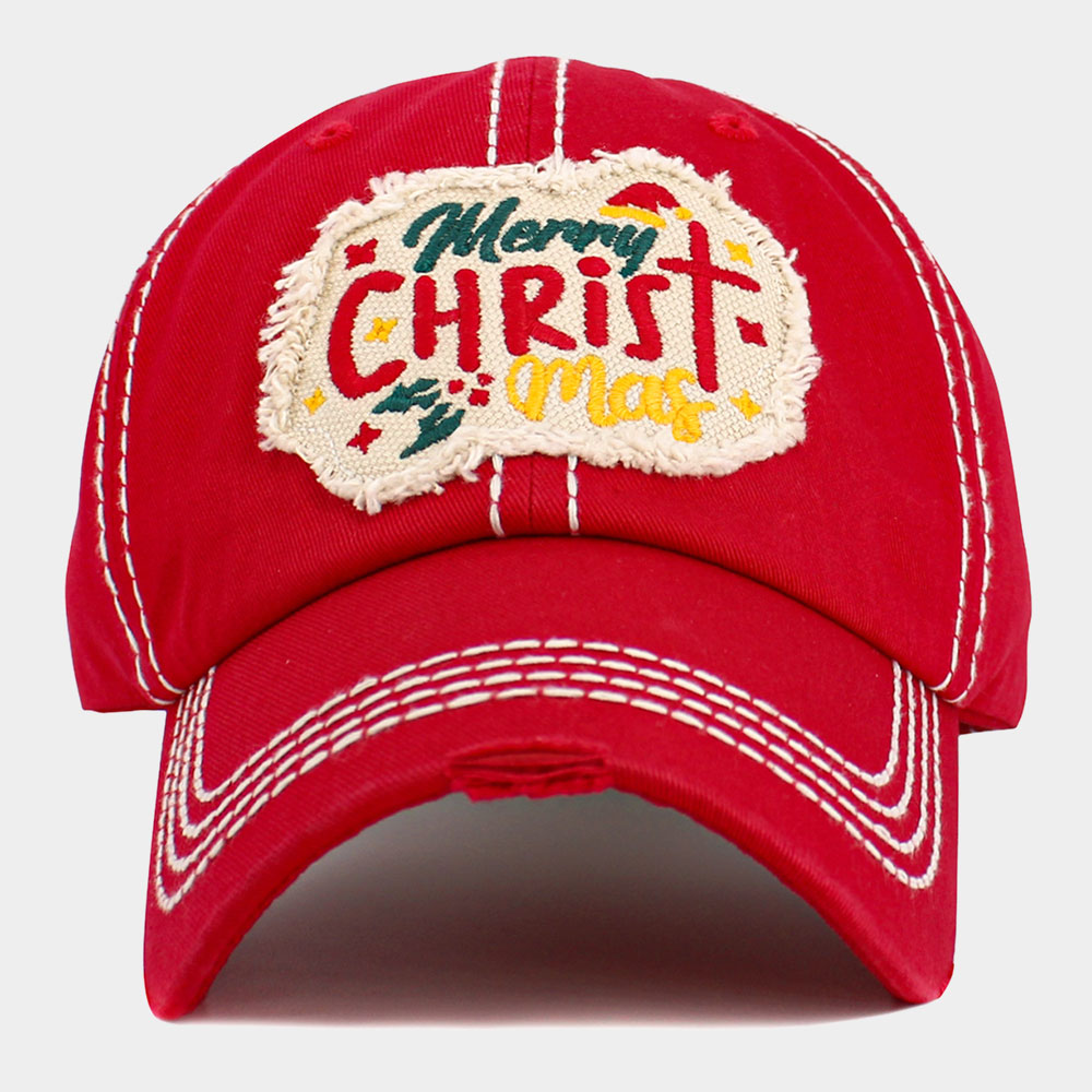 Details • Crown Circumference : 23" (Adjustable) • Crown Height : 4.25" • Brim Height : 2.75" • Material : 100% Cotton • Celebrate the season in style with this festive baseball cap featuring a cheerful “Merry Christmas” embroidered patch. Designed with contrast stitching and a casual, distressed look, this cap adds a fun holiday touch to everyday wear or festive gatherings.