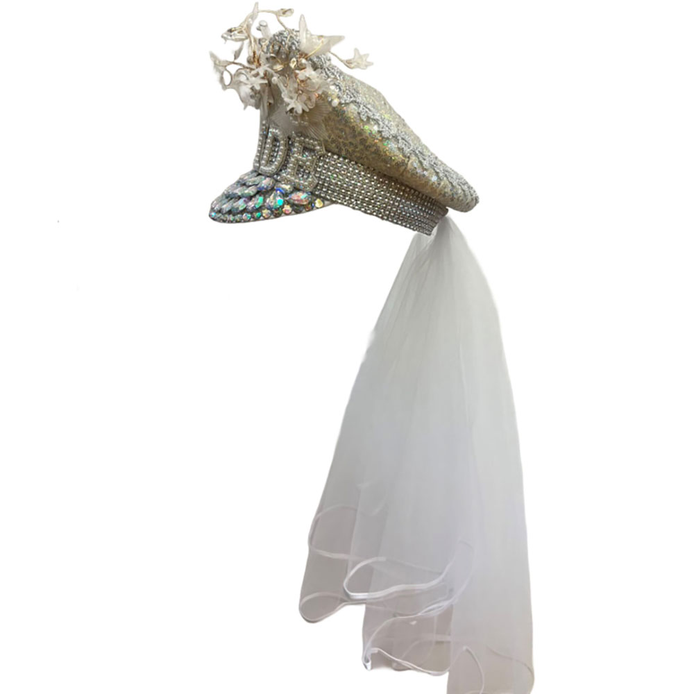Details • Crown Circumference: 23" • Crown Height : 5" • Brim Width : 2.5" • Celebrate in style with this dazzling bride captain hat, featuring pearl accents, floral embellishments, sparkling sequins, and a flowing veil. A perfect statement piece for bachelorette parties and bridal showers.
